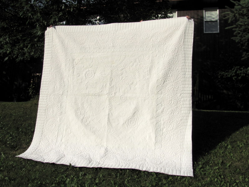 I was asked to quilt this by a friend of mine who is a member of a small quilting group in South Gillies. I was given free reign on how it would be quilts so I chose to outline the applique and freehand fill the background of the centre. Freehand swirls in the green border, feathers in the pink border, and piano keys in the final border.
