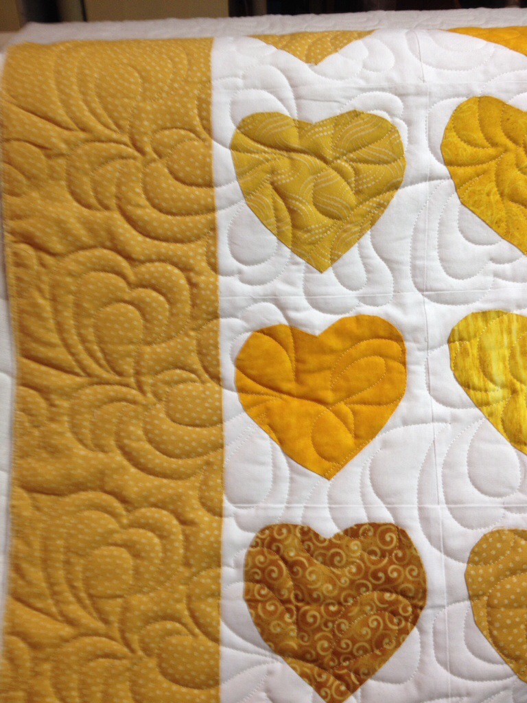 Next up the Anniversary Quilt, it was quilted with a Panto called Here and There, I chose it as it has both a heart looking shape as well as a feathery look without being overly feminine as it is a gift for a couple on their fiftieth Anniversary.