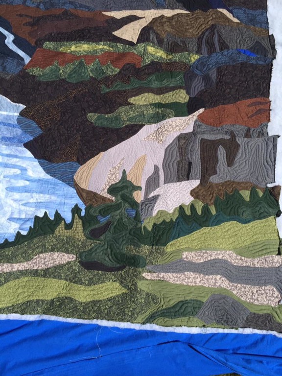 Leslie is a local Arist who brought me her queen sized hand pieced landscape quilt depicting a scene of the Rockies. This quilt lived with me and on my design wall for some time until one day it had spoken with me enough to start. This quilt and I went on a journey so to speak, an adventure. It was for the most part fun to work on though also challenging as I wanted to be sure to capture Leslie’s vision and also bring movement and capture the light of her work.