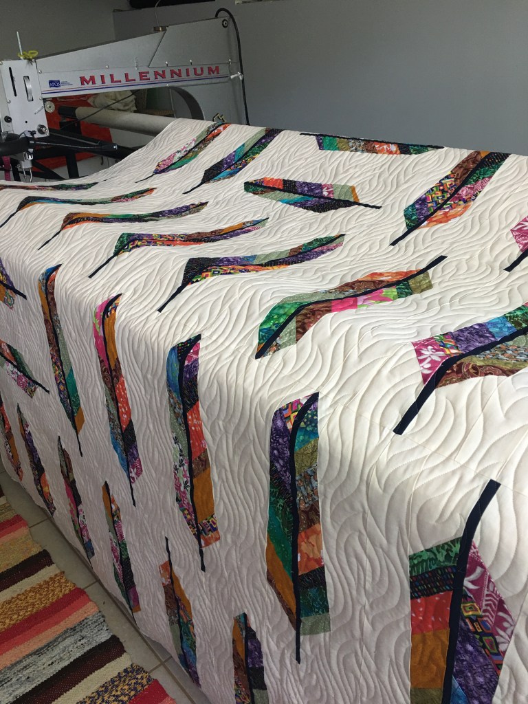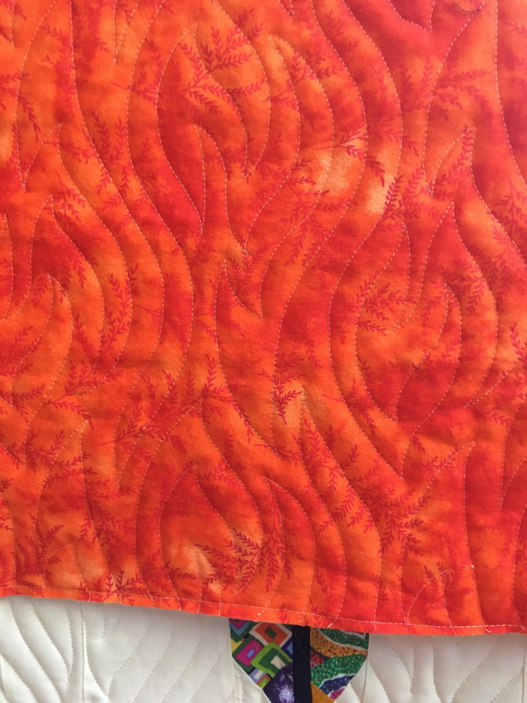 I love orange and this backing made me think of flames. The top was perfectly pieced and fun to quilt. This was one that was hard to give back.