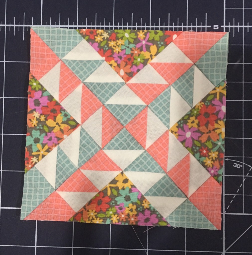 Working on this recent block my mind was elsewhere I guess or maybe I was just tired and I trimmed my half square triangles to the finished size which led me to make a much smaller than intended version.