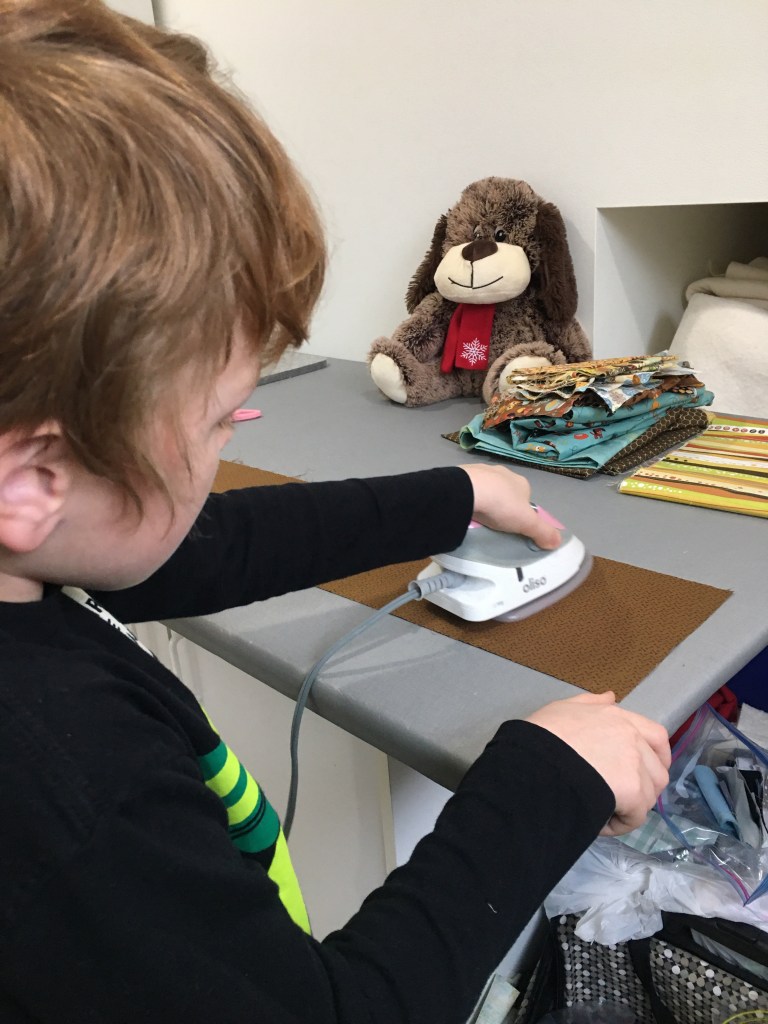 Thankfully I still had a good stash of the Max and Whiskers fabrics along with other coordinating fabric. Liam mastered ironing. We worked on using the rotary cutter but both agreed that this time Grandma would finish the cutting.