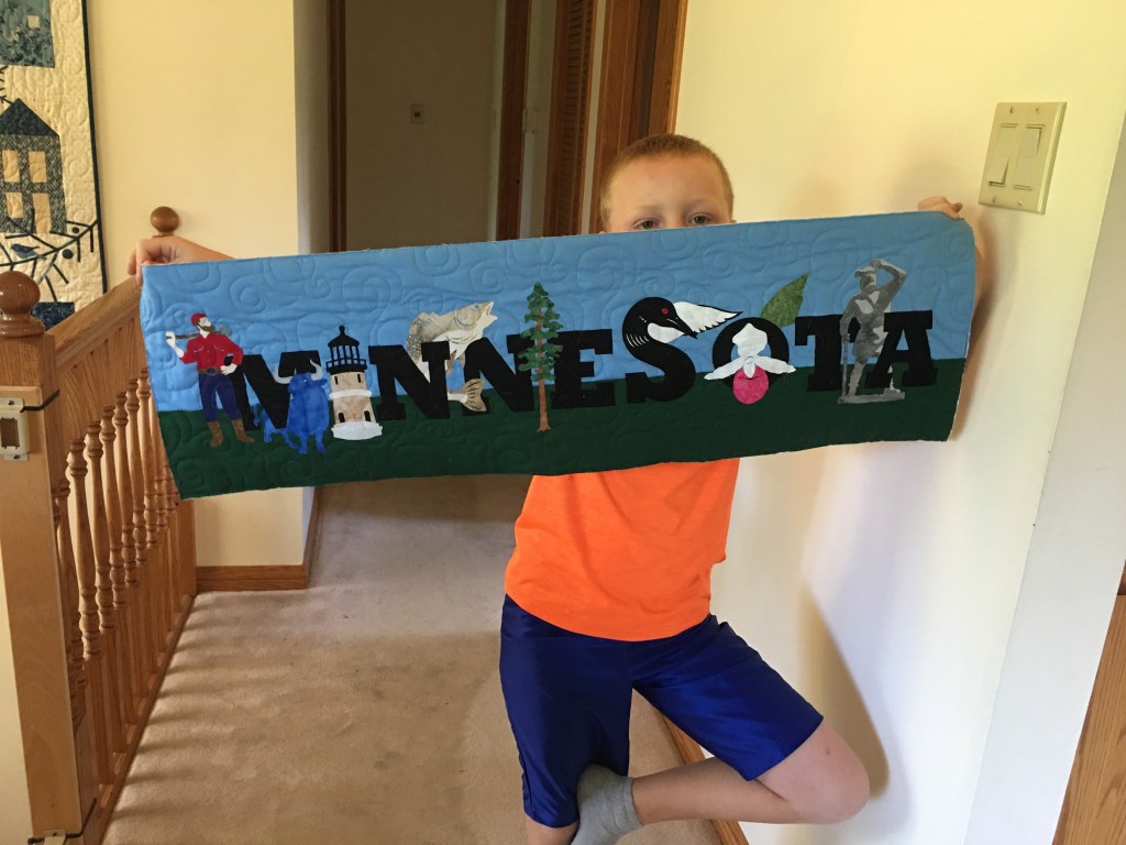 It wasn’t lost on my quilt model that he has been to all three of the places on the small hangings…
