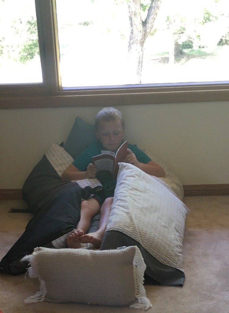 Liam on the other hand has had hours of fun with them. Yesterday after arriving he created a little nest for himself so I handed him the book he has been reading…