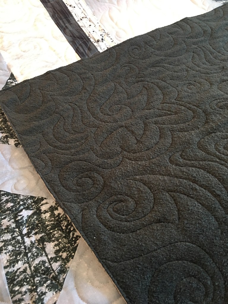 She chose a perfect dark charcoal Fireside for the backing. I pieced two lengths for the quilt….this fabric is so nice to work with and my only recommendation is to take the time to check the nap direction.
