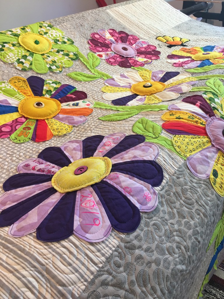 Now years later we have met in person and she has given me the privilege to quilt some of the quilts that she is making for her grandchildren. This first one is made using Dresden plate as flowers each flower has writing on it from family members.