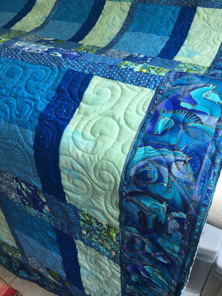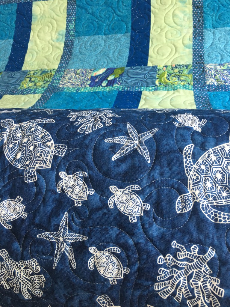 It was a pleasure to quilt this pretty quilt with the sea turtle backing. I used the pantograph called Waterworld. It gives such great movement to a quilt.