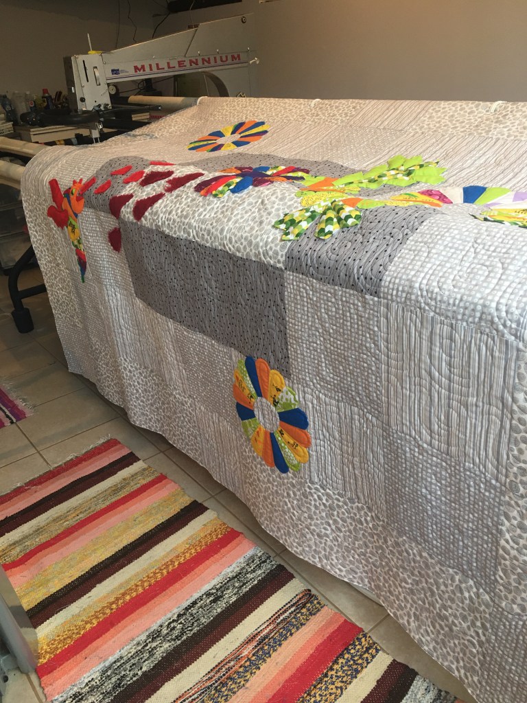The second of two quilts that Pam designed herself is ready for binding. It is quilted with a pantograph for the background and then custom in and around the appliqué.