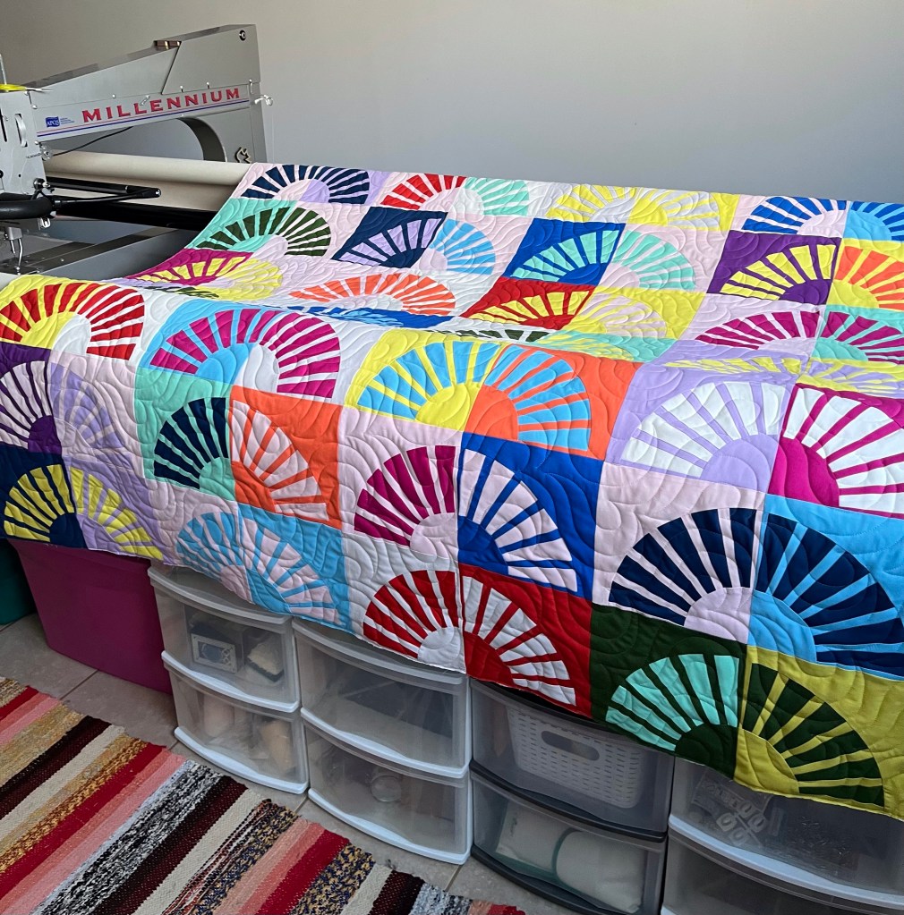 This weekend after finishing up a customer quilt, I gifted myself time on the Longarm for Sunny. The backing reminds me of tie dye a bit and also carried many of the tops colours. I love finding just the right backs for my quilts!