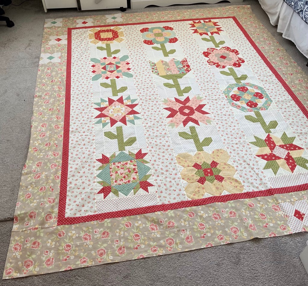 This long ago project was started and the blocks all completed, the finishing kit purchased only to be stored in a boot box for ten years.