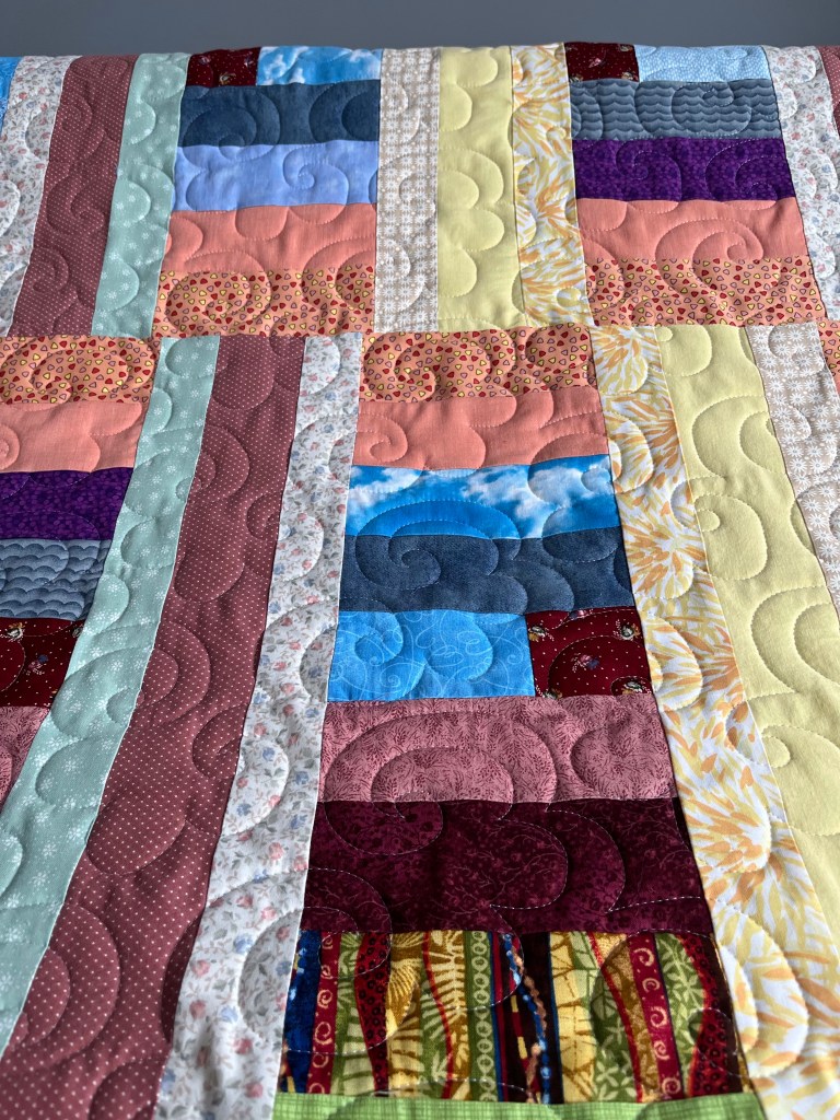 This quilt is an example of a fun and easy scrap quilt! I used the pantograph Popcorn as I always reminds me of clouds and the backing called for just that!