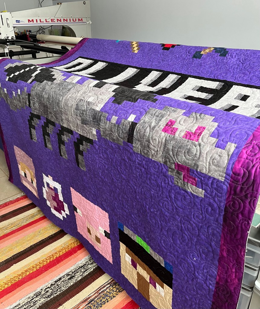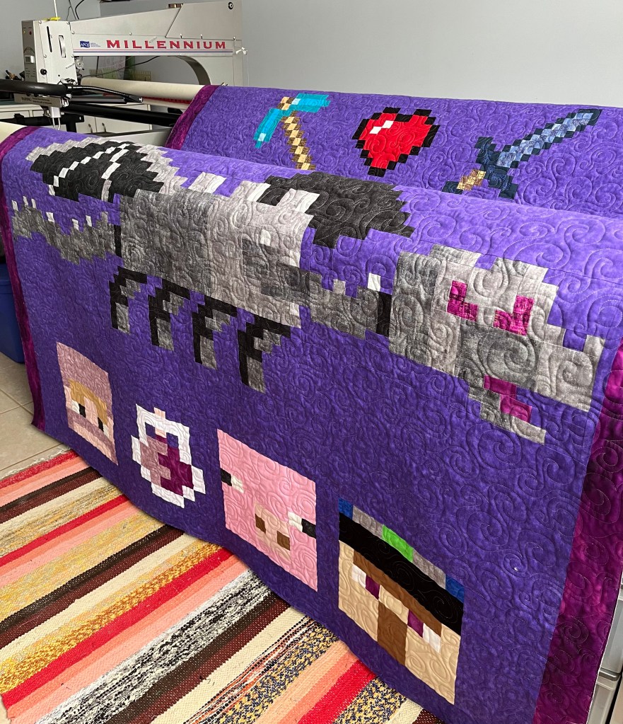 The pattern for this quilt can be found on https://www.kellifanninquilts.com/p/minecraft-sew-along.html. It was part of a sew a long and the designer has kept the block patterns up for others to enjoy. She also included the patterns for lettering and the dragon that was used for the backing.