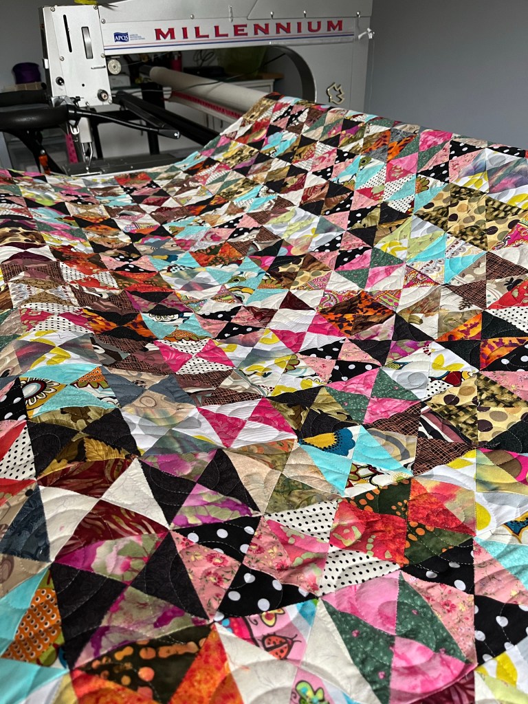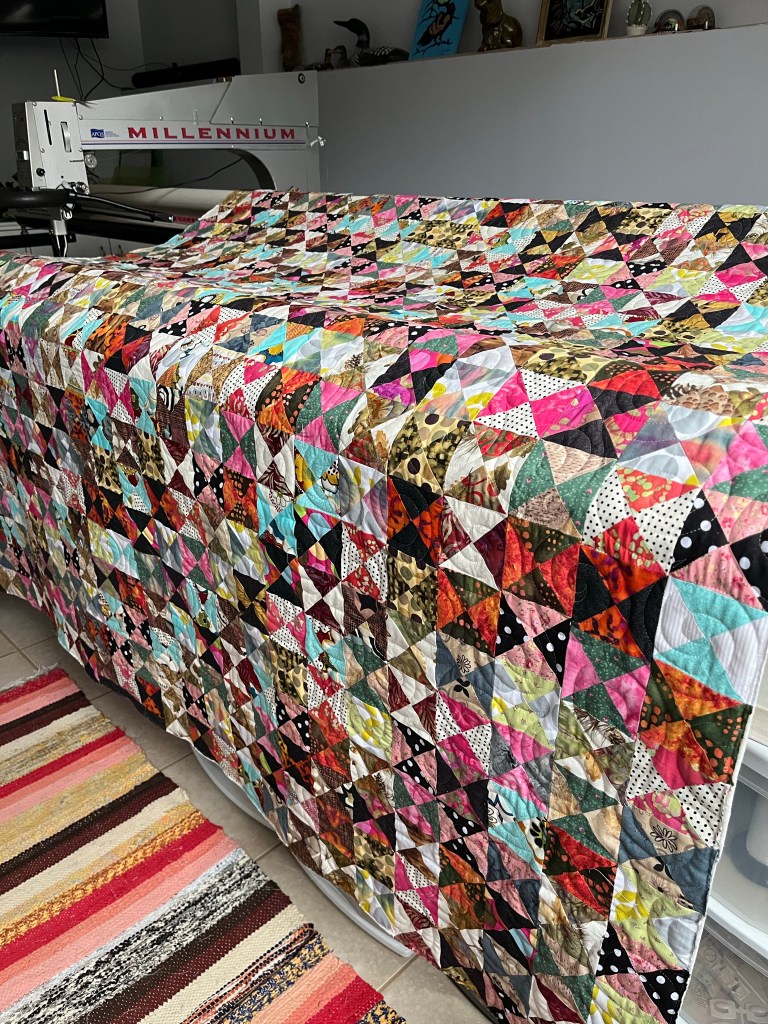 How much fun is this quilt…well it was for me. I love scrap quilts and this one made with the makers scraps from all of her other quilts just blended into a beautiful collage of colour.