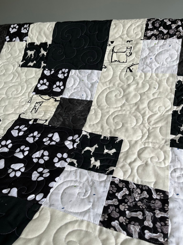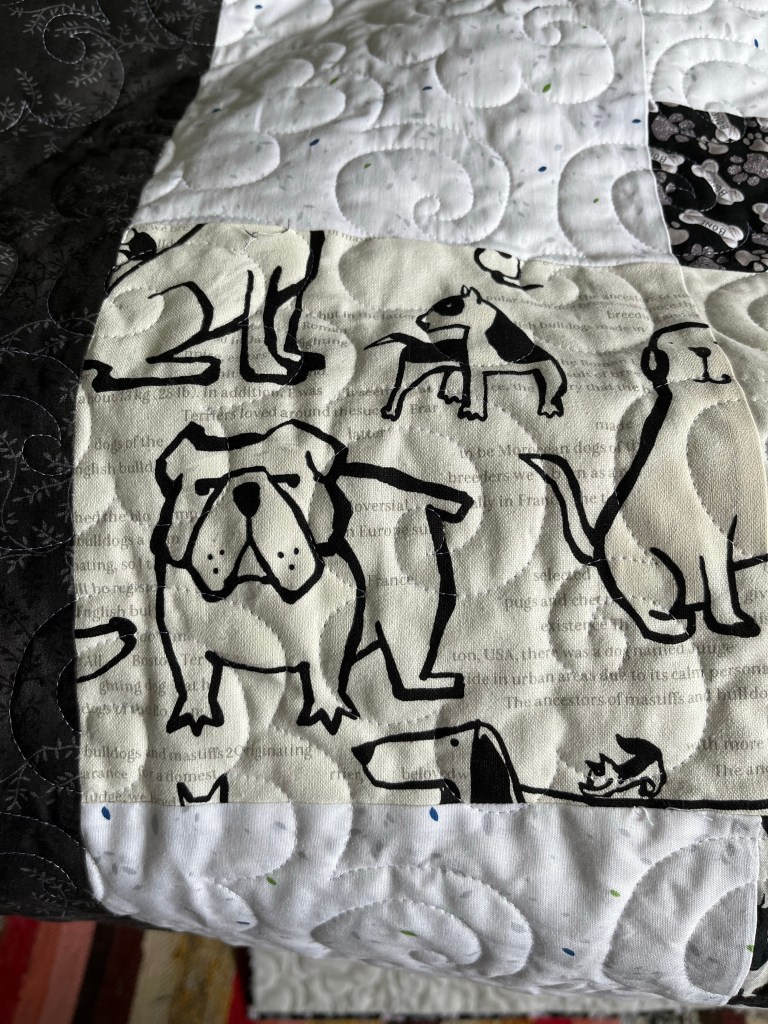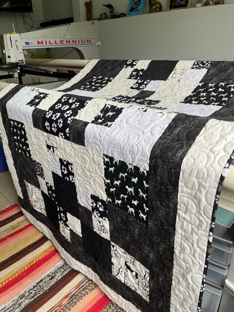 This was a really fun quilt to work on, Liam doesn’t often as for one of the quilts he see’s me quilting but this was one of them. It was made to be raffled in support of a dog show club that she belongs too.
