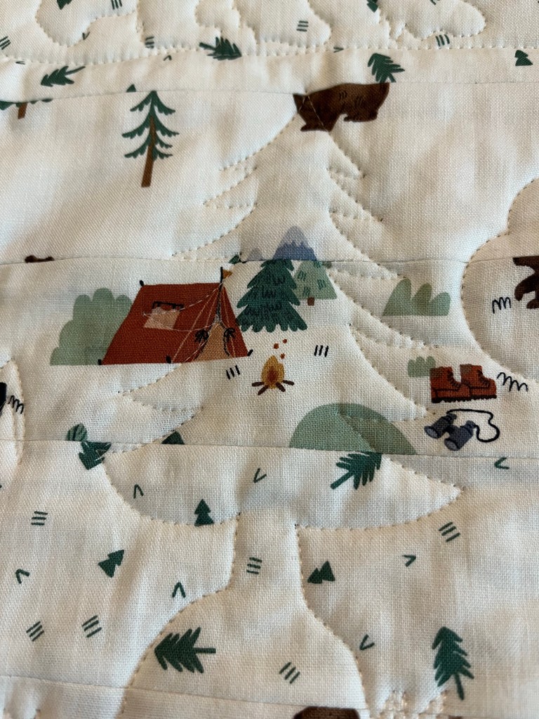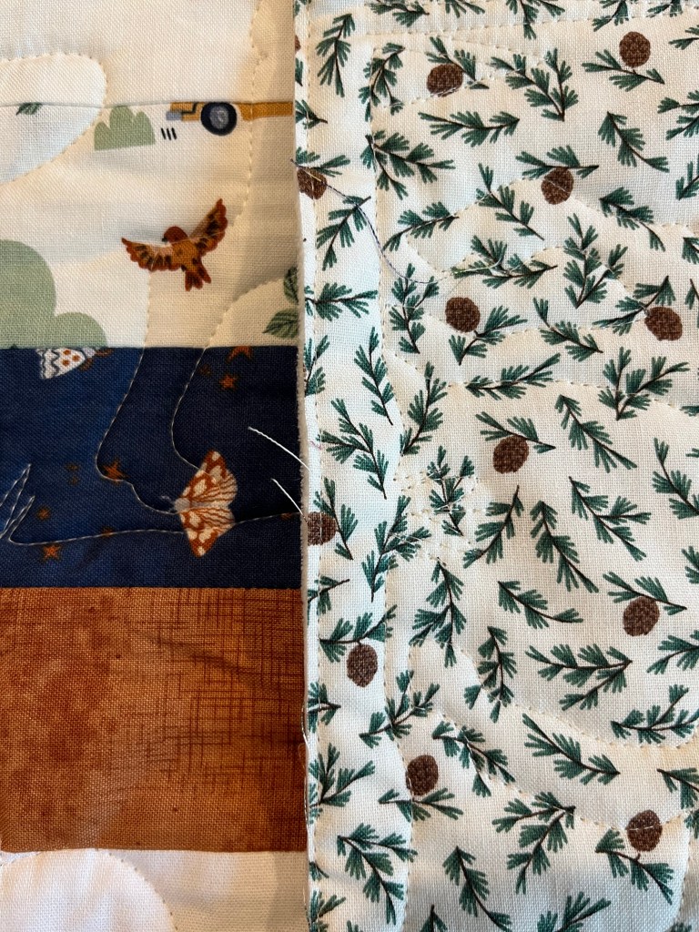 This fun quilt was a first quilt for its maker. The name of the recipient …her nephew was pieced and added to the back….and I might add beautifully done.