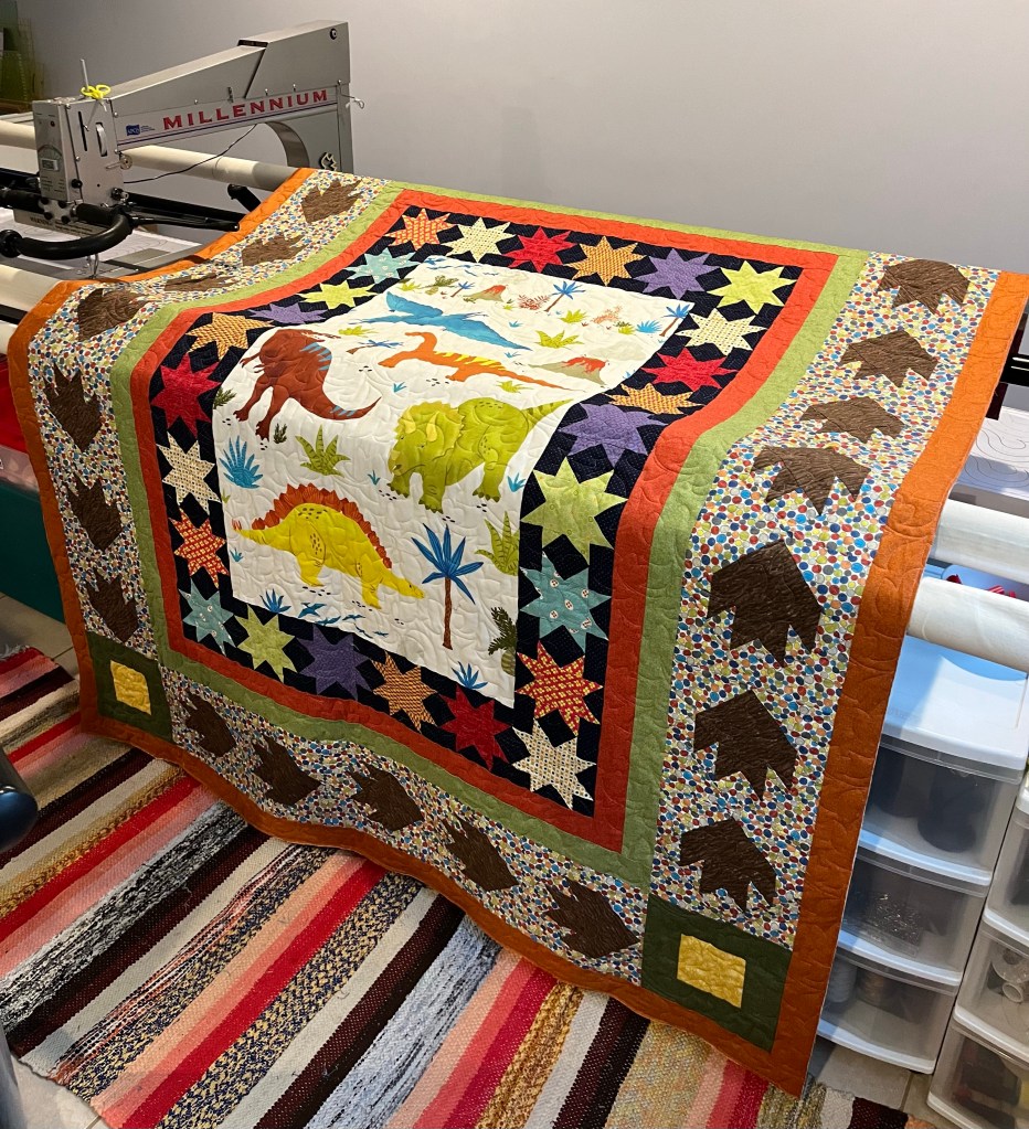 This quilt is a great example of beginning with a panel and adding on with different blocks to create a quilt top. The backing was inspired I believe from searching on Pinterest.