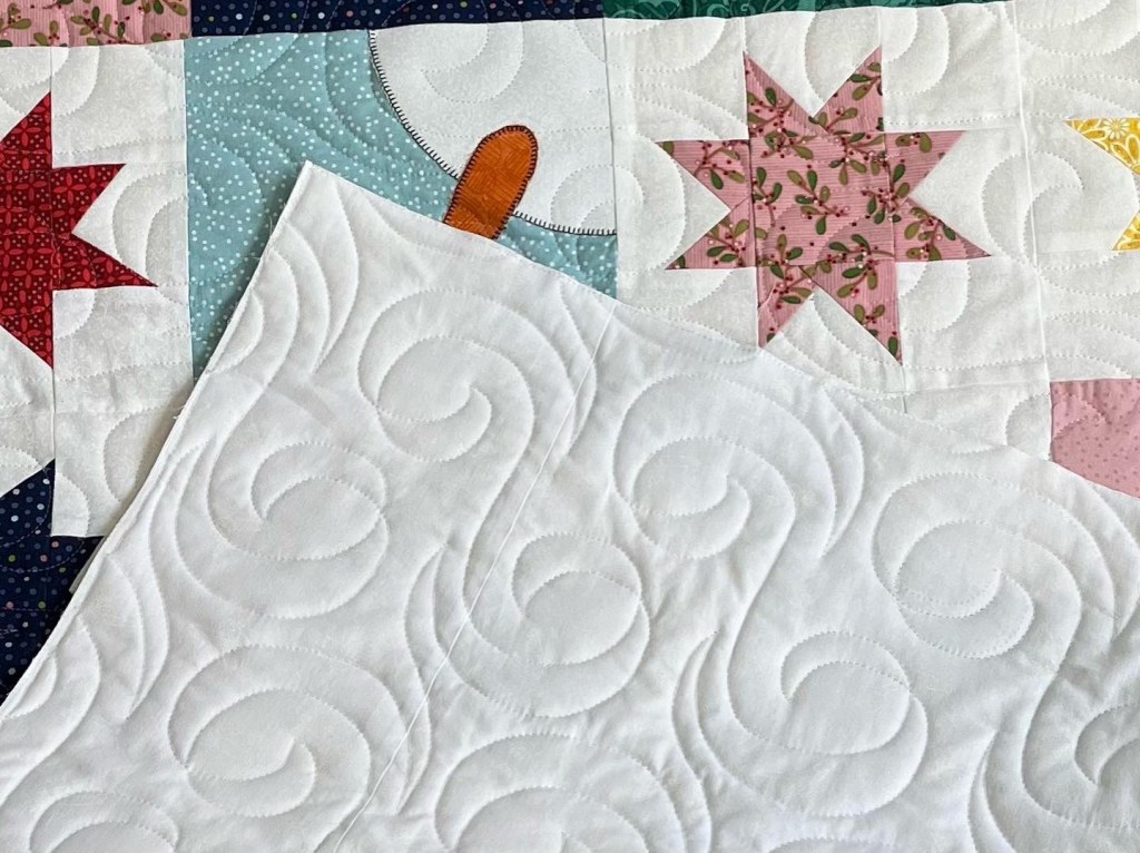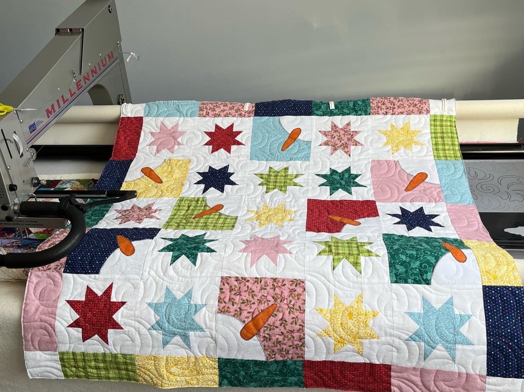 A nice swirly pantograph design (windswept) was a perfect choice to add a simple background to the fun snowmen in her quilt.
