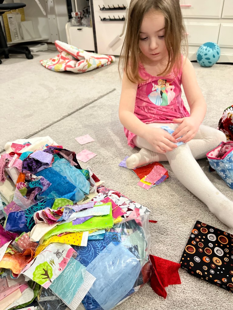 We made a pouch with scraps and when I dumped out my in use scrap basket I was reminded of my initial love of scraps! She filled her little pouch with scraps and has had hours of fun!