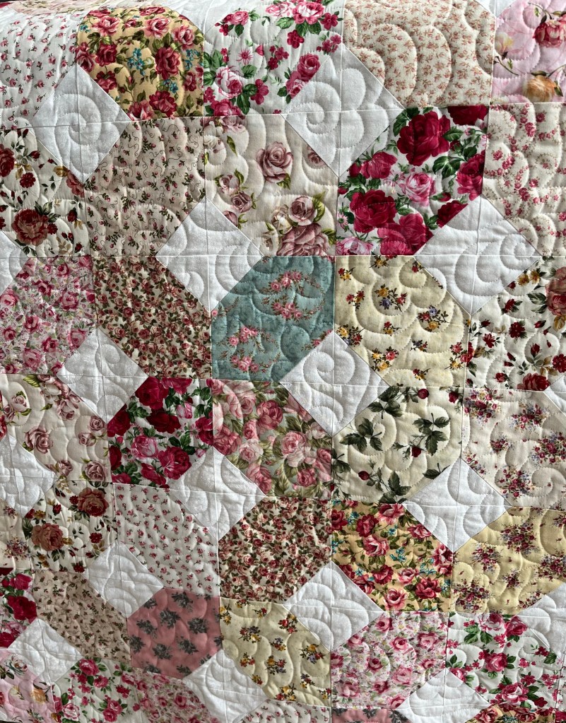I really like the affect of laying a corner of the quilt top over the backing for the above picture as it was really hard to capture the true white backing and the soft pretty floral prints. This picture is a really close match.