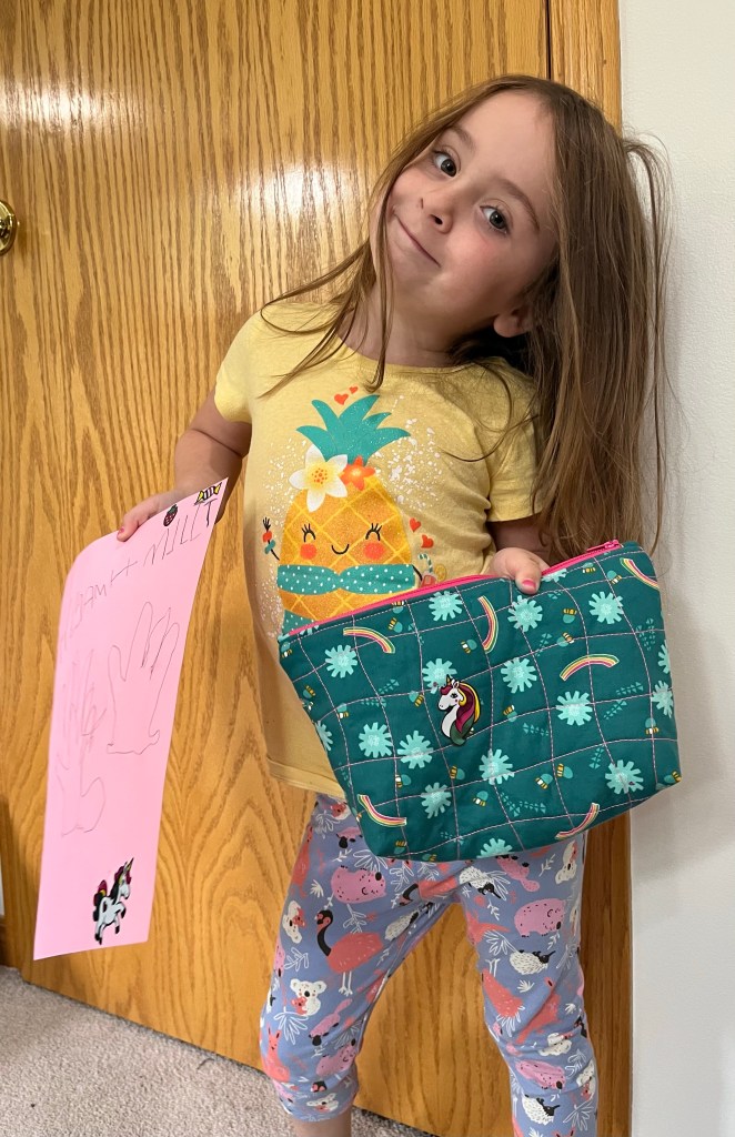 Kaija loves digging into my scrap basket and I love both watching her and letting her decide what to use. For this project she chose the outside fabric because Mommy loves rainbows! The bright yellow lining made her smile and she knows where my zipper drawer is and chose pink.