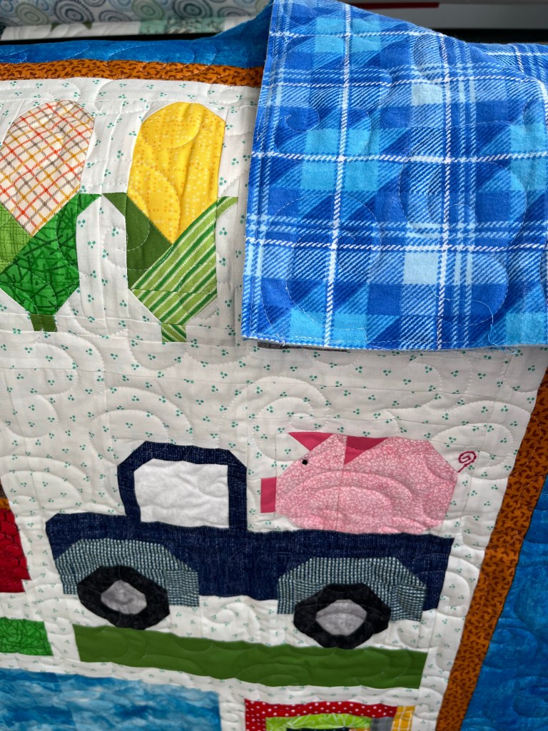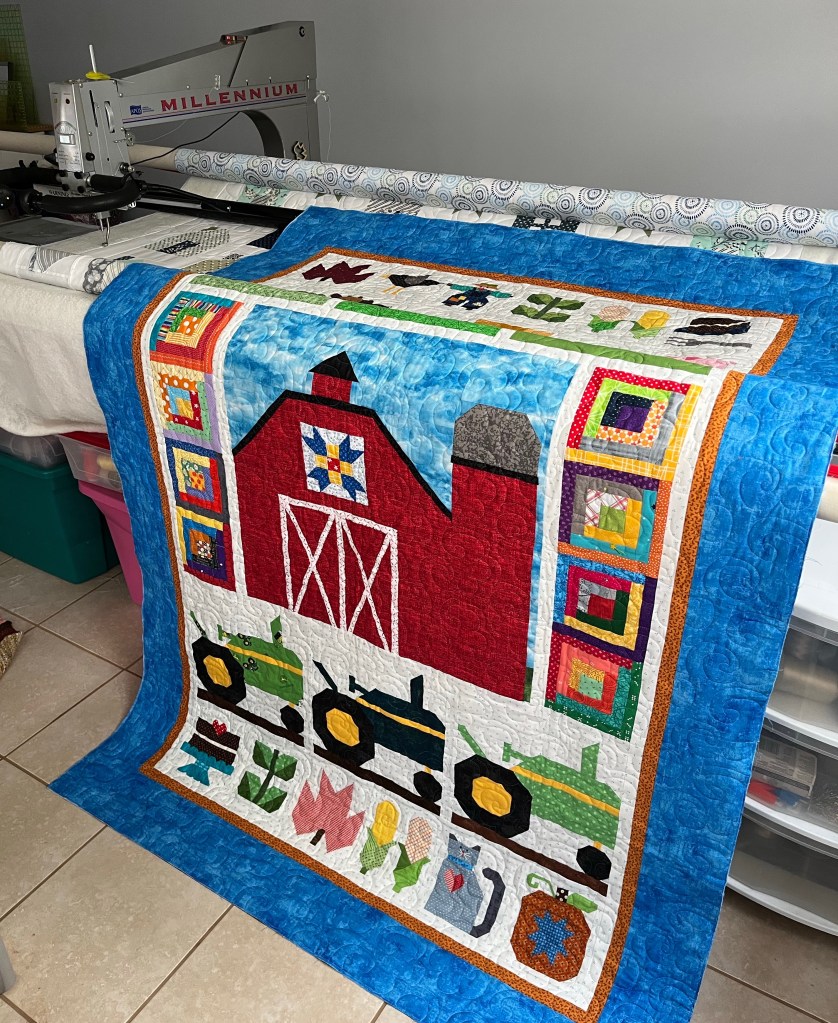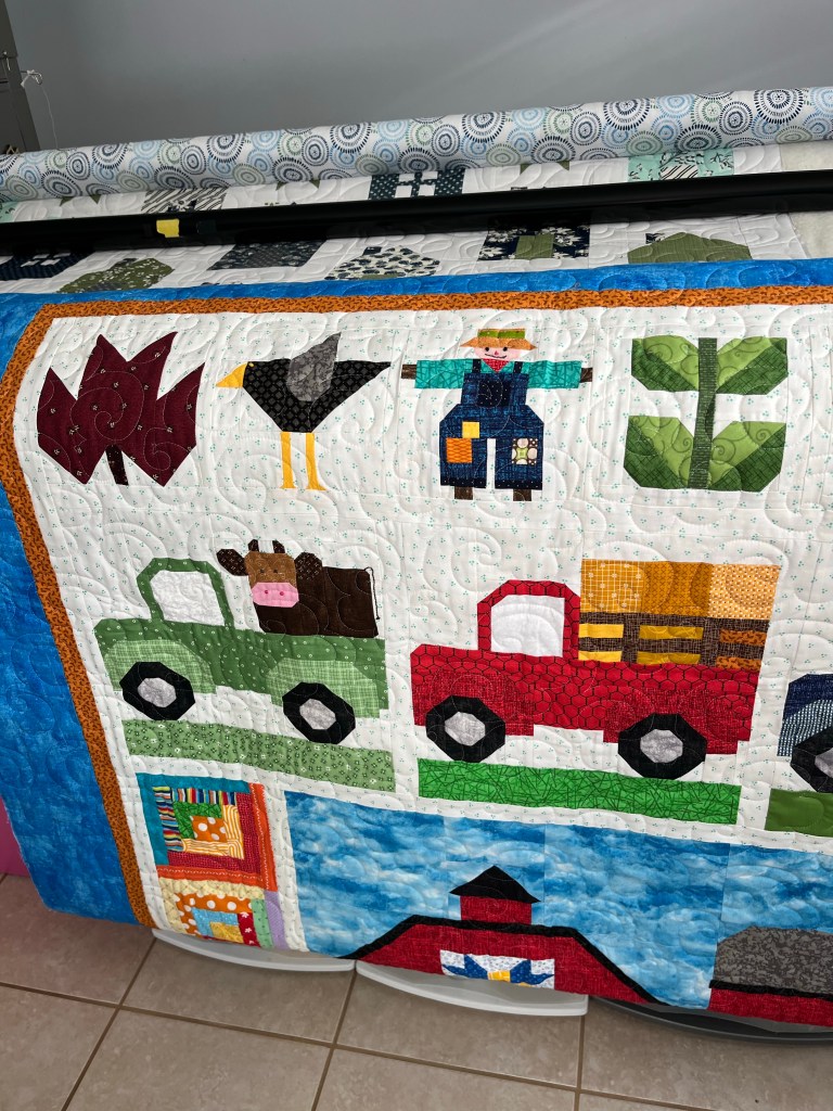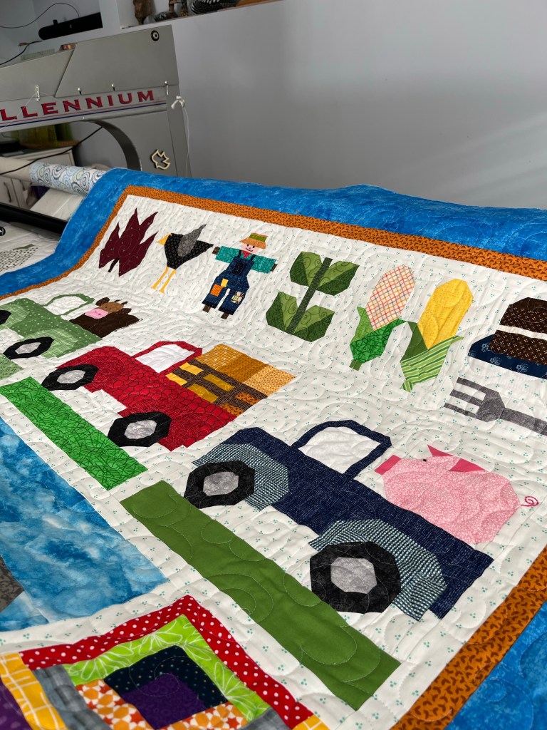 Karen’s son in law requested a quilt. Having grown up on a farm it was decided that a farm themed quilt would be perfect.