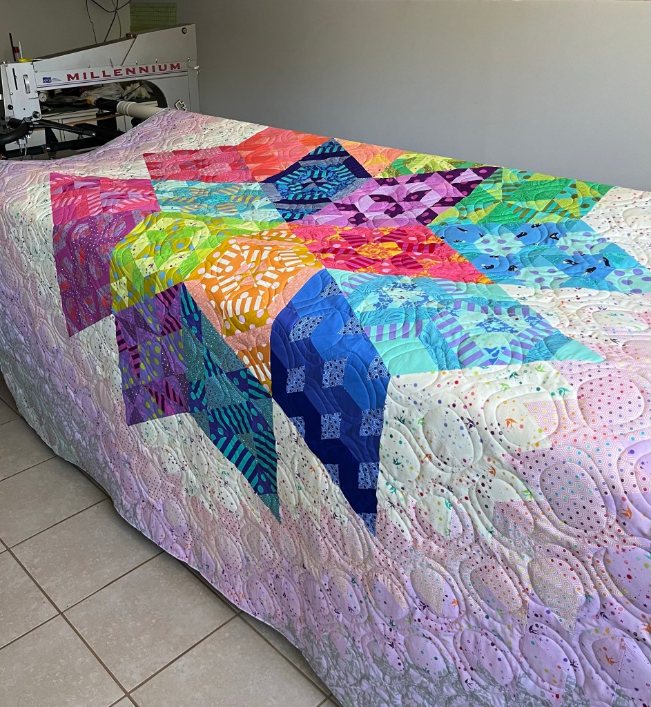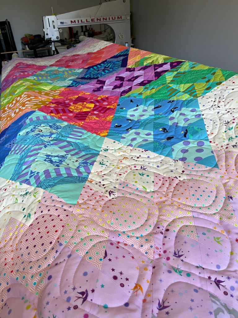 After looking through several options for a quilting design Suzanne chose Belly Bop, it is a fun and medium dense design that plays so nicely over these modern prints.