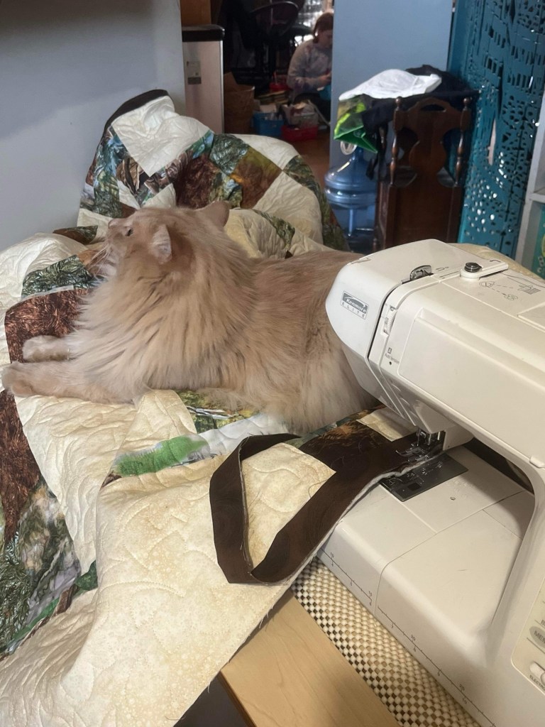 This quilt was trimmed and ready for binding and yesterday I was sent this picture of how the binding process was going with Beth’s assistant!