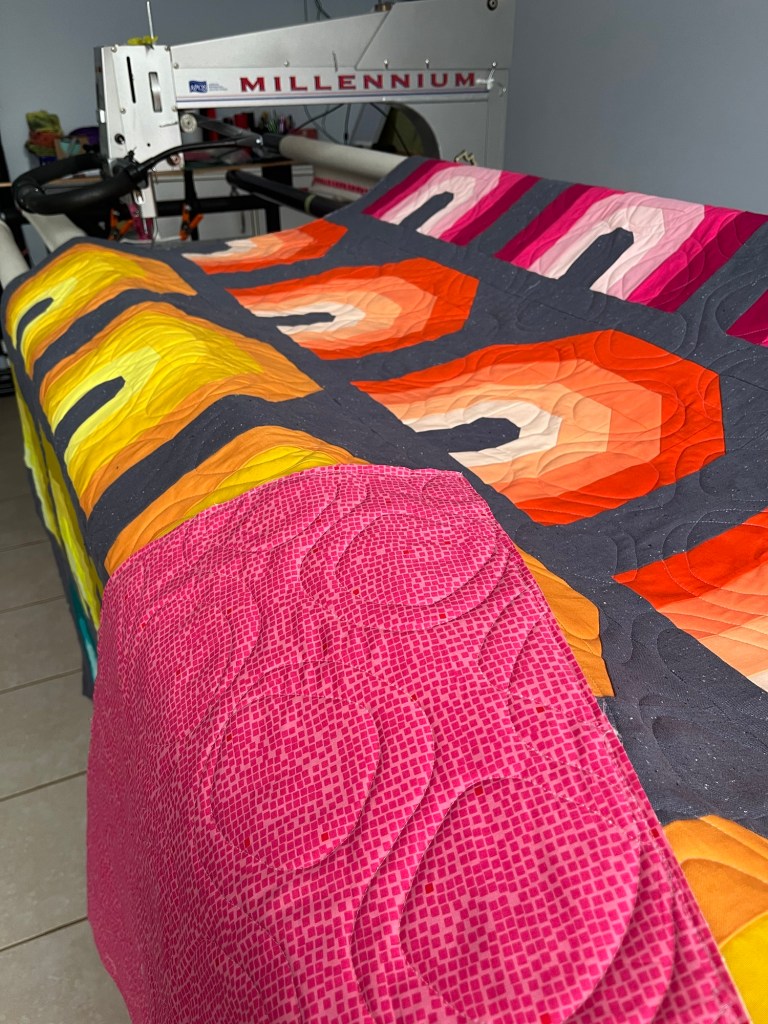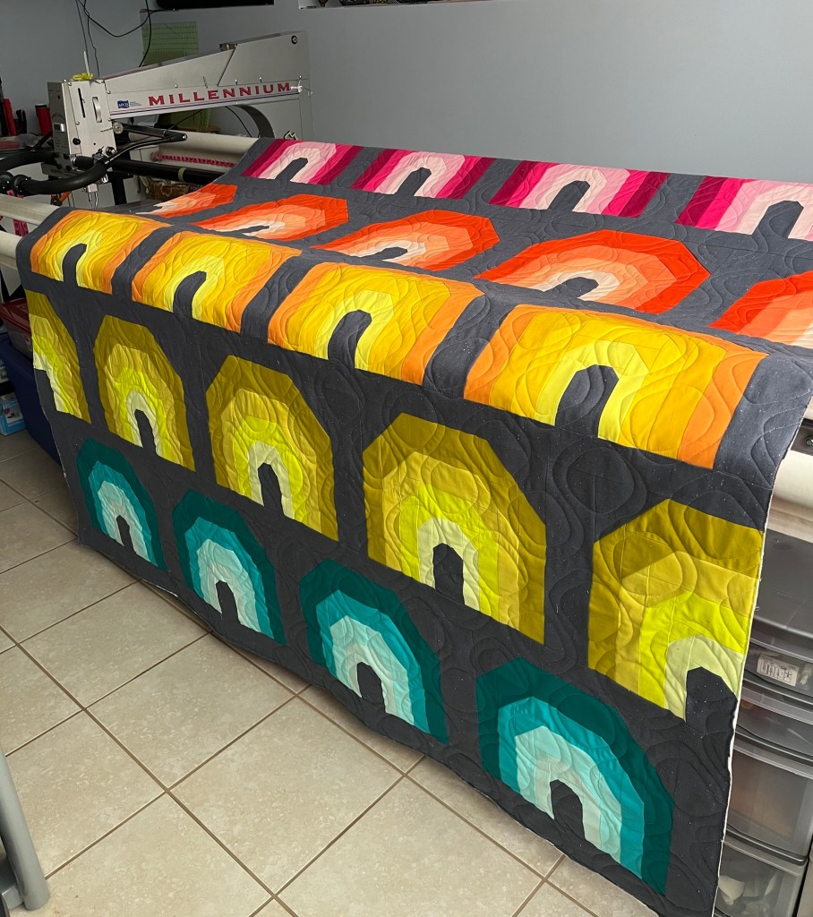 Betty pieced the pattern Polychromatic by Elizabeth Hartman for her son. He and his wife chose the pantograph Belly Bop for the quilting design.
