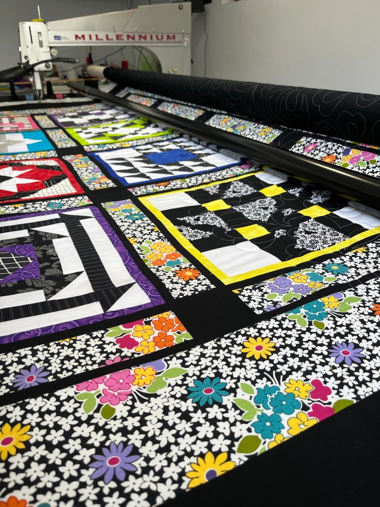 Finding a backing for this large queen size quilt that she liked for her quilt was difficult and so she chose solid black yardage which I pieced for her. She chose the pantograph Here and There for its heart like design linking the love between her and her Grandmother.