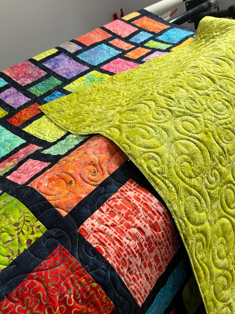 My initial thought was wow, I love all of the colours in this quilt, how fun!! On closer inspection of the fabrics…all batiks had various shapes ranging from bubbles, dots, curls, swirls, flowers and leaves and more.