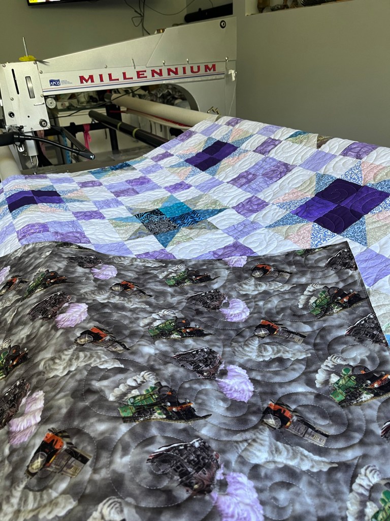 Both of these quilts were fun to add my touch to. This first one with its trains and the steam coming from the engine on the backing made me think of swirls…bear with my imagination…