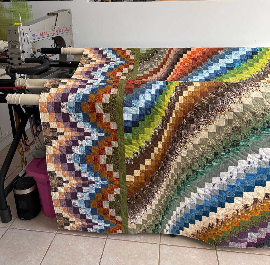 This amazing quilt graced my frame last week! It was beautifully pieced and thankfully with all those seams its maker Donna took a Victory lap around it when she completed her piecing!