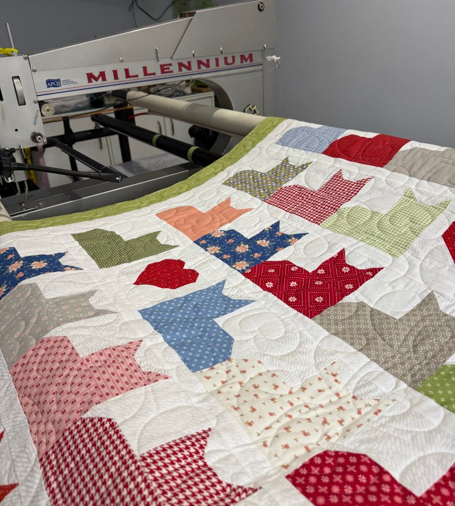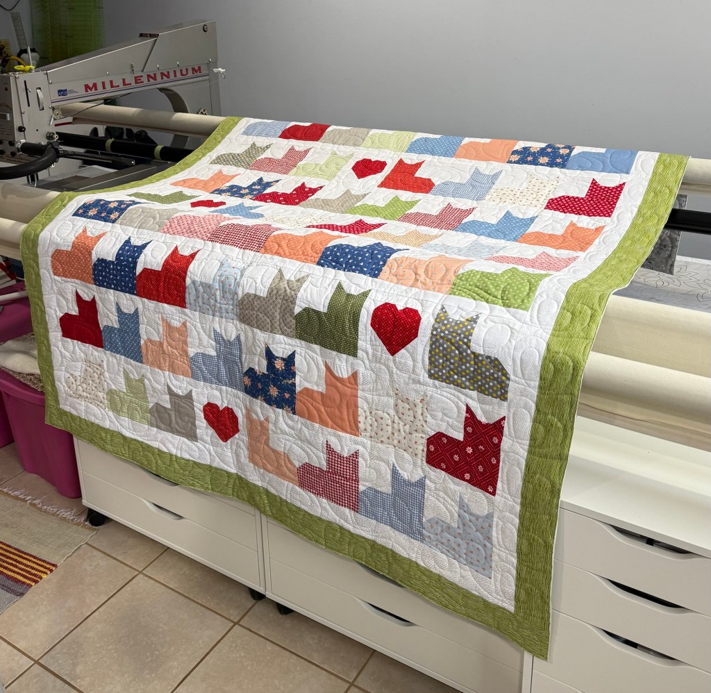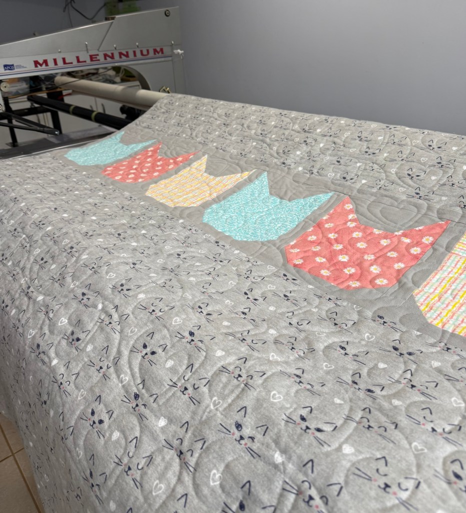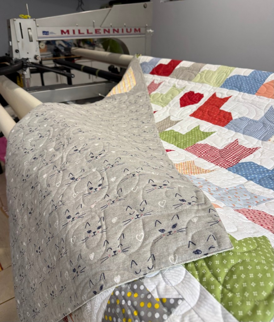 My customer made this adorable quilt to gift to her kitty loving friend. She used cozy flannel for the backing that was already so sweet and added pieced kitties to make it even sweeter …