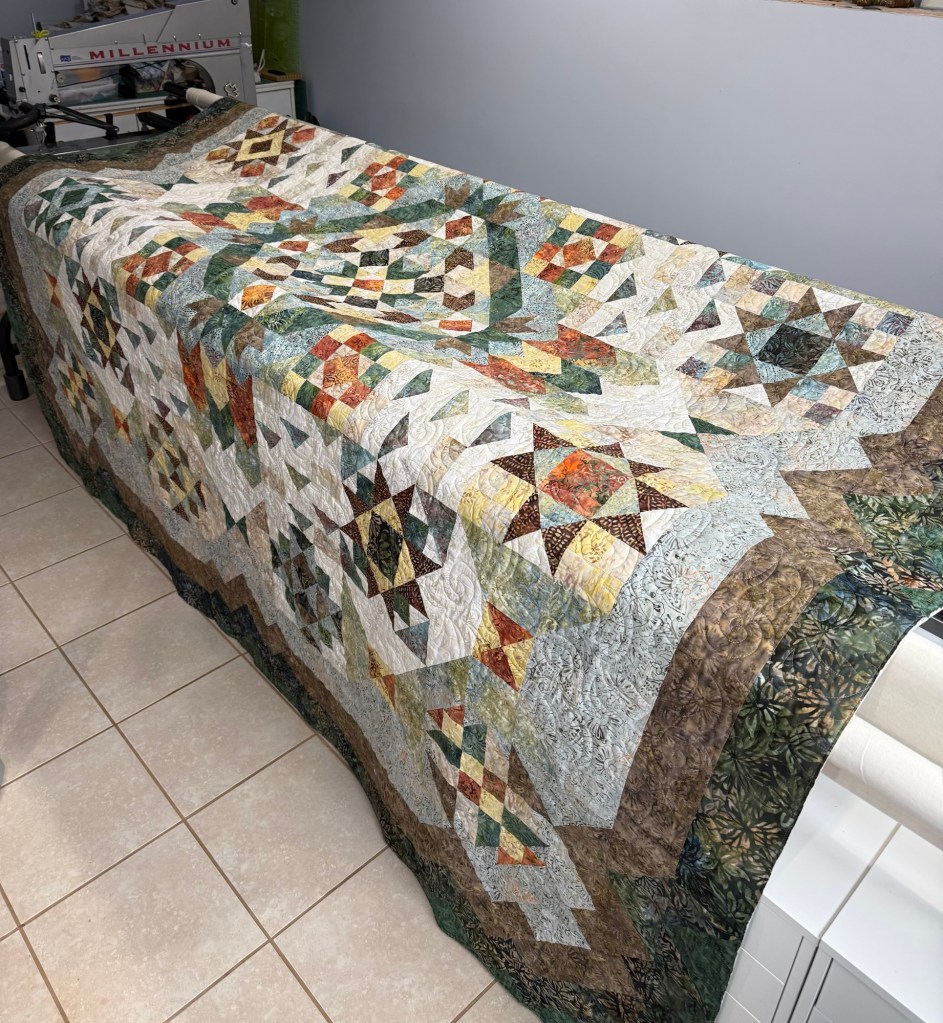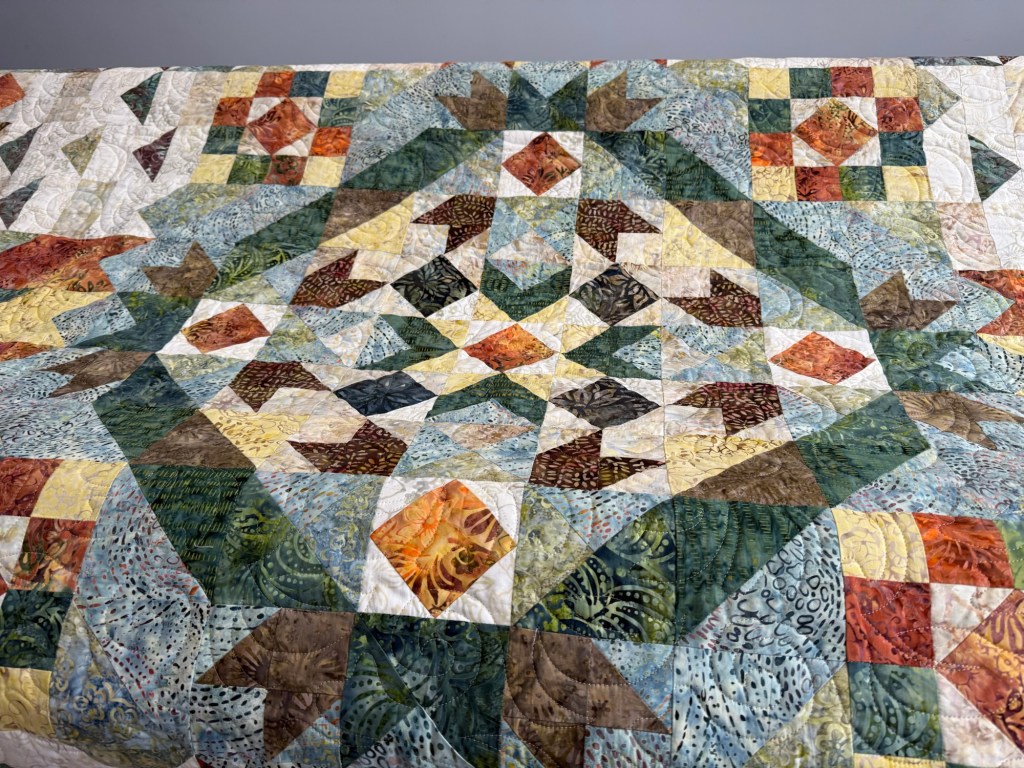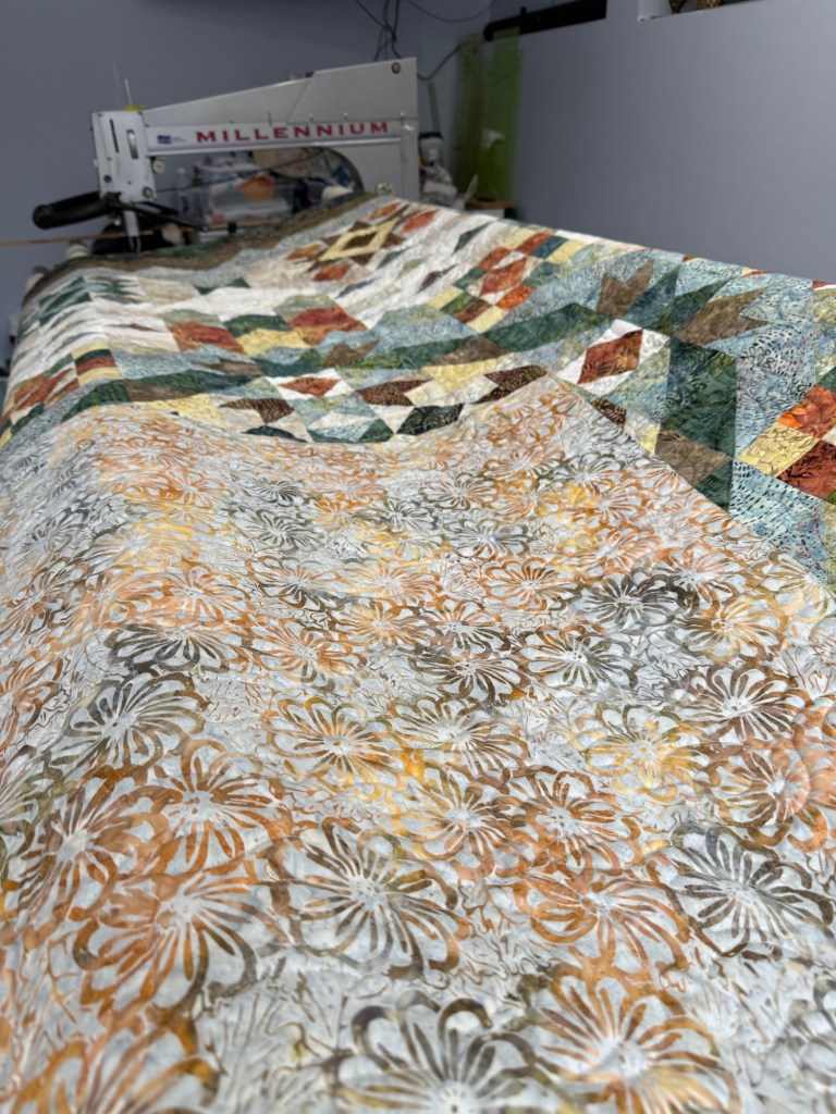 We chose the quilting design A Little of This which softly plays on the designs of some of the batik fabrics. Its density flows so beautifully over this quilt, which will allow for a perfect drape over her bed.