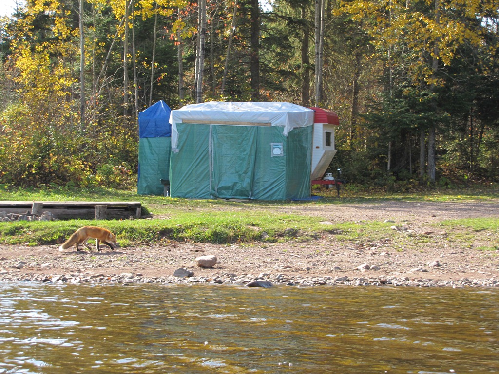 Moose Hunting season opens tomorrow morning, this hunting shack had been set up and left waiting for the weekend. I have a feeling that’s why the fox was hanging out. When we returned with the boat the door to the shack had been opened just enough for someone the size of a fox to get in.
