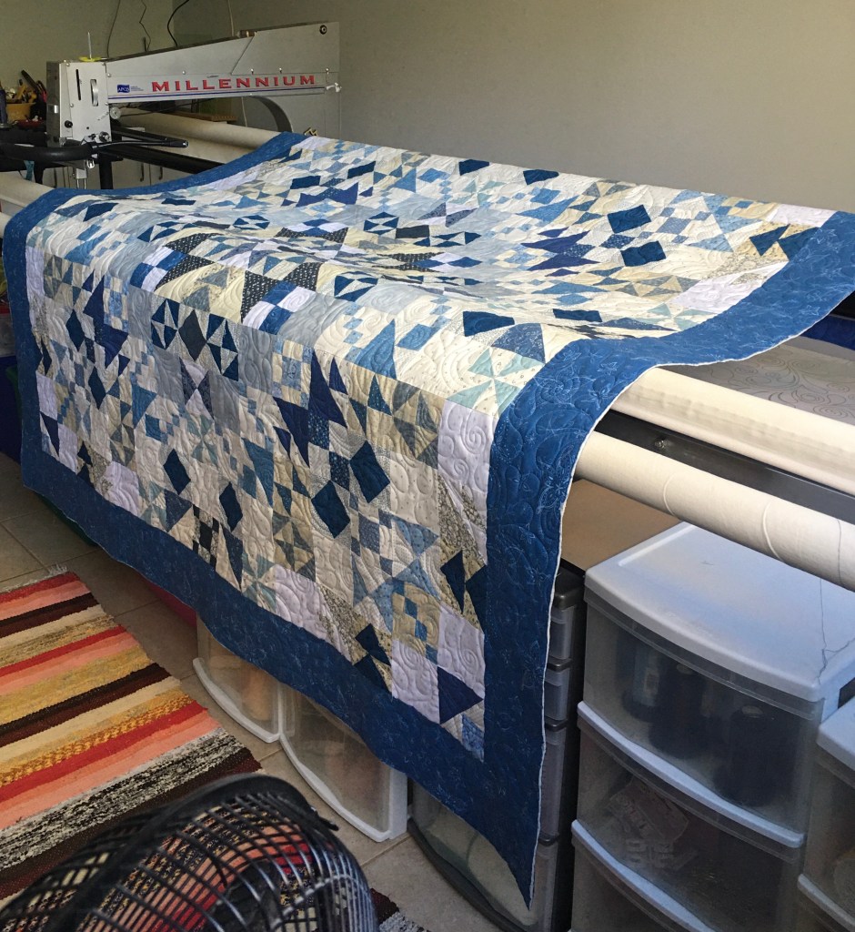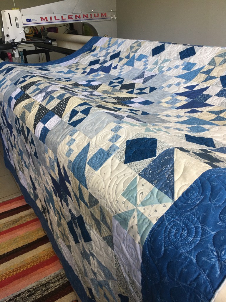 I chose the pantograph Feather Grande by Bethanne Nemesh and it just danced along on this beautiful quilt. The quilting really shows on the back, again those blues!!