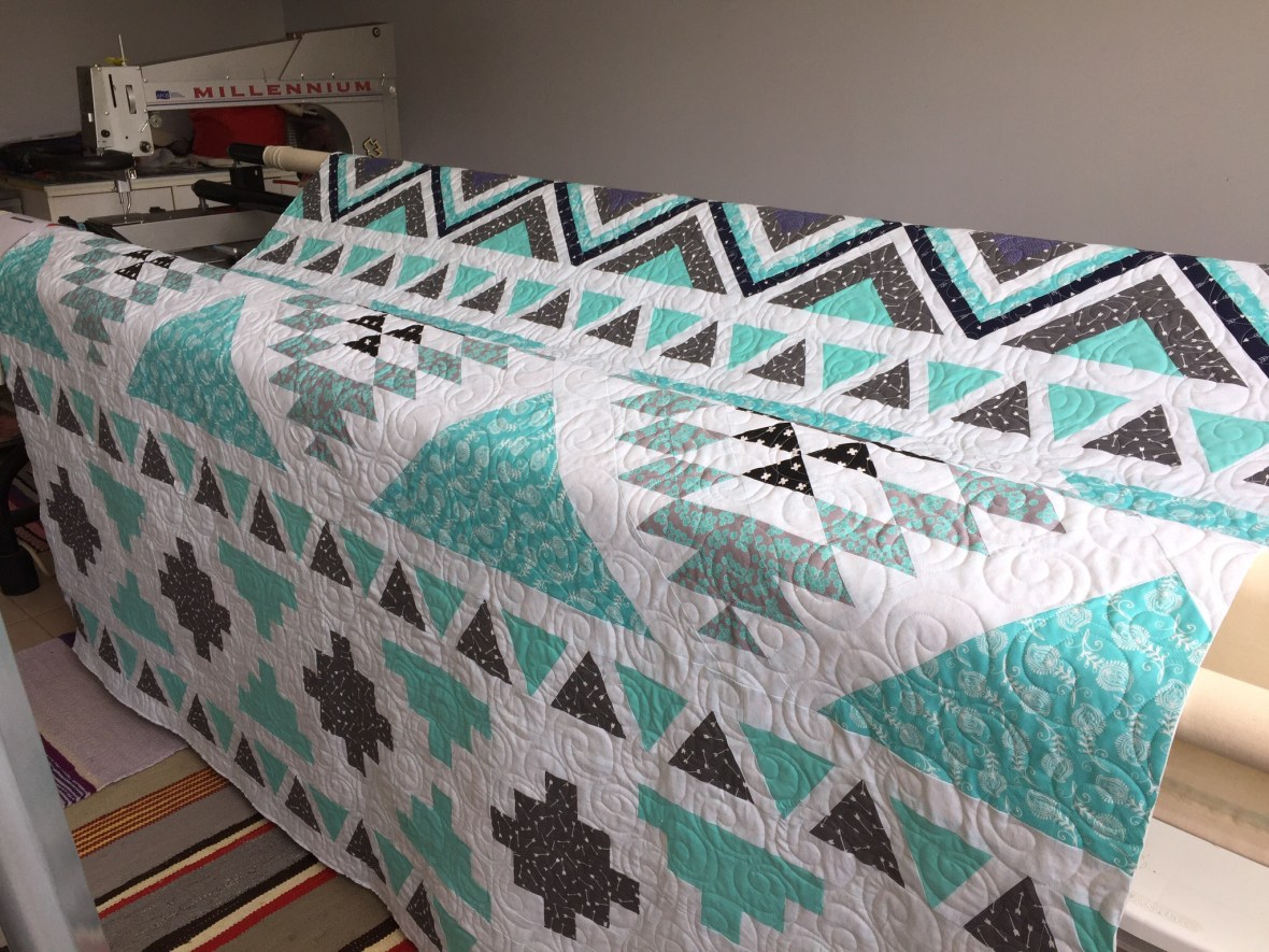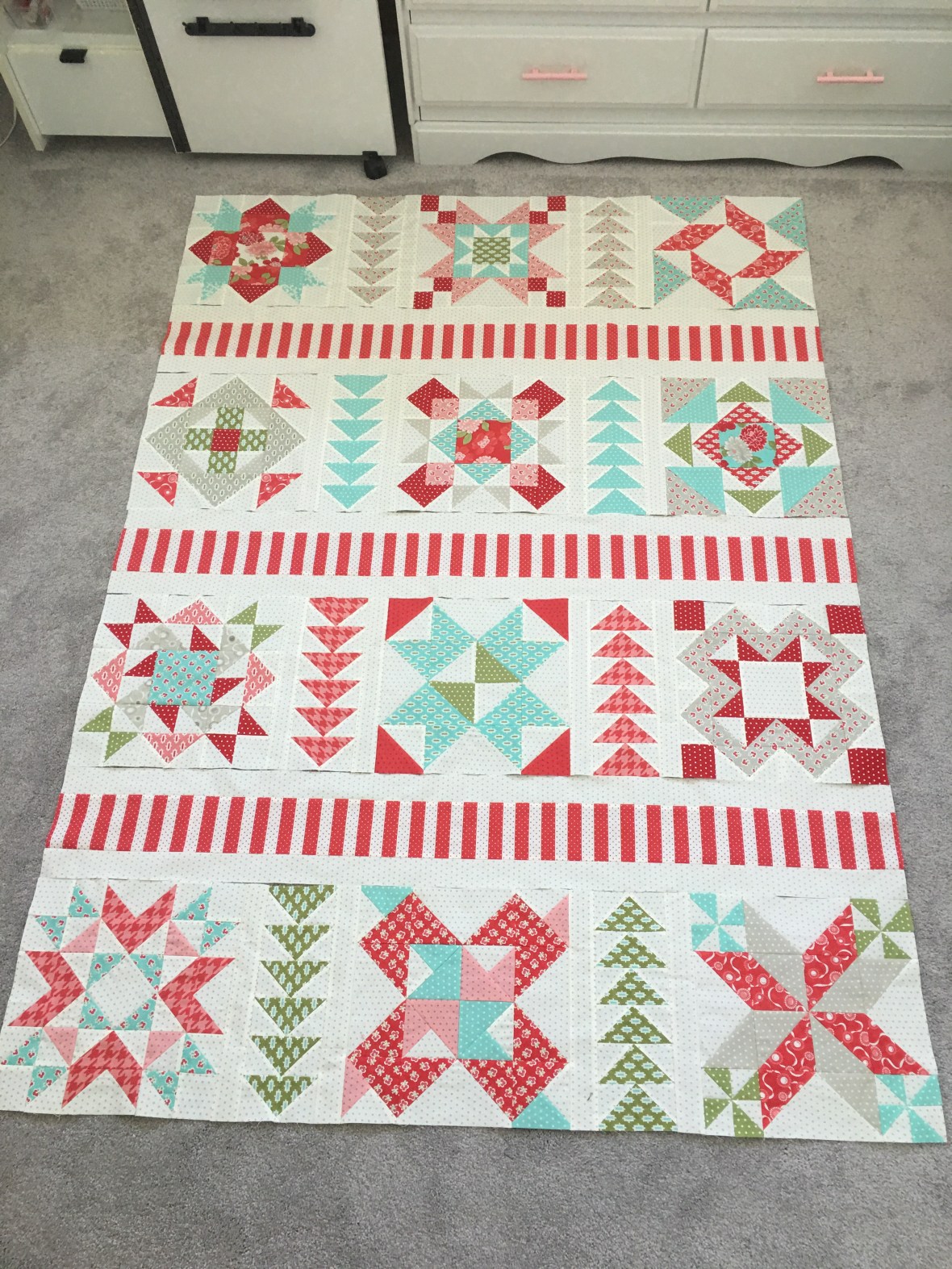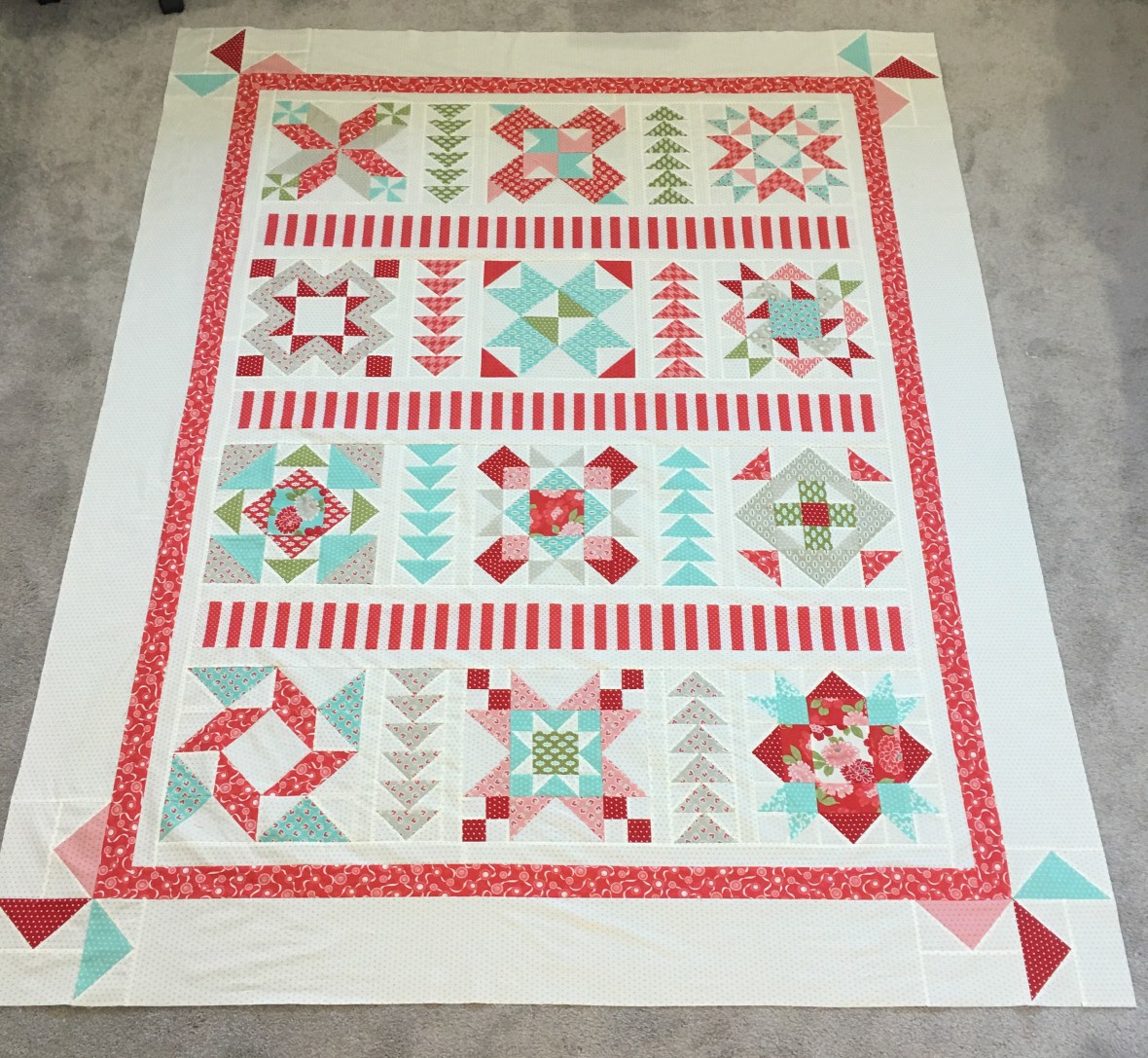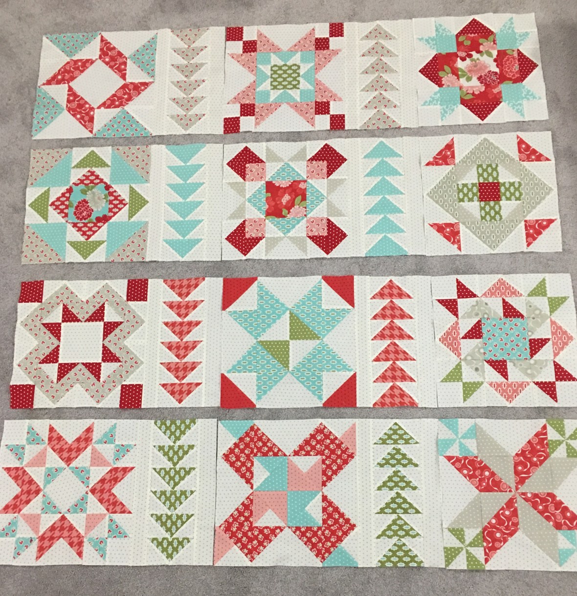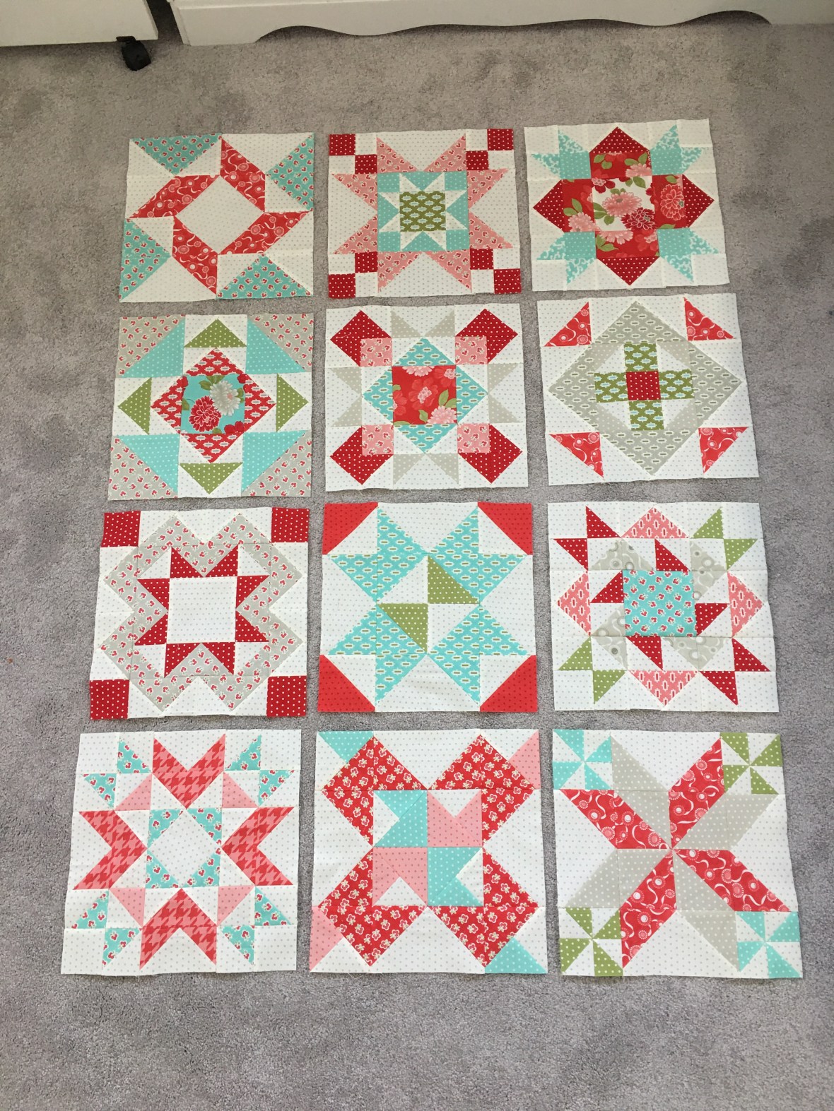 I had seven blocks completed when I got home and it didn’t take long before I had all 12 finished and moved on to the finishing kit!