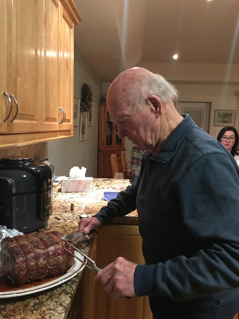 Dad cooked the roast in his Green Egg bbq and it was cooked to perfection and carved just right. What a treat!