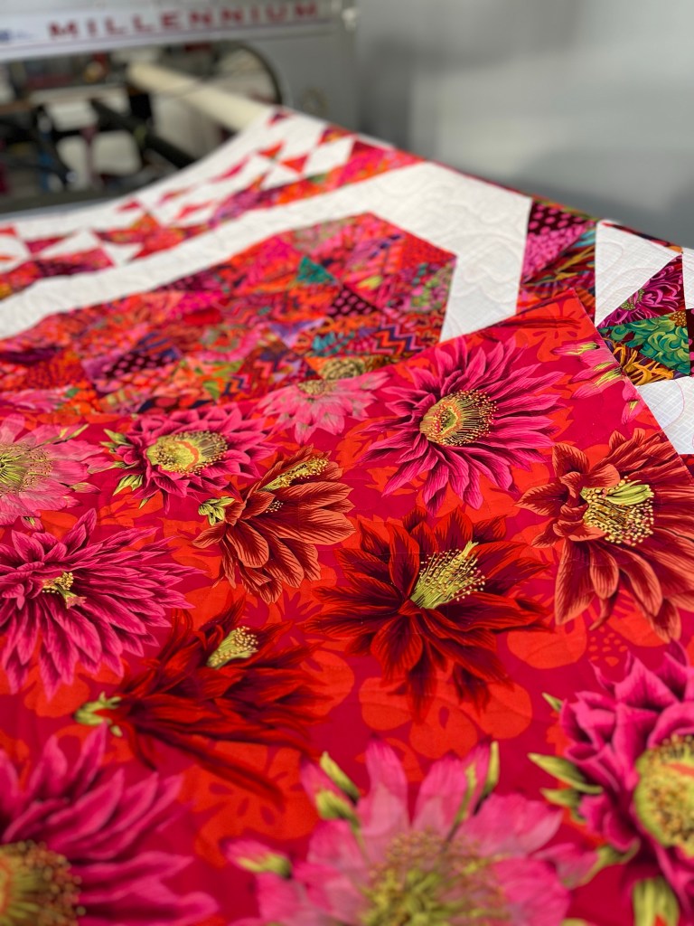 I am not always a fan of using a dark or contrasting thread when quilting an edge to edge design as it can leave areas with partial design showcased that looks odd. However in this case that was not at all an issue with all of the white background that really showcases the quilting.