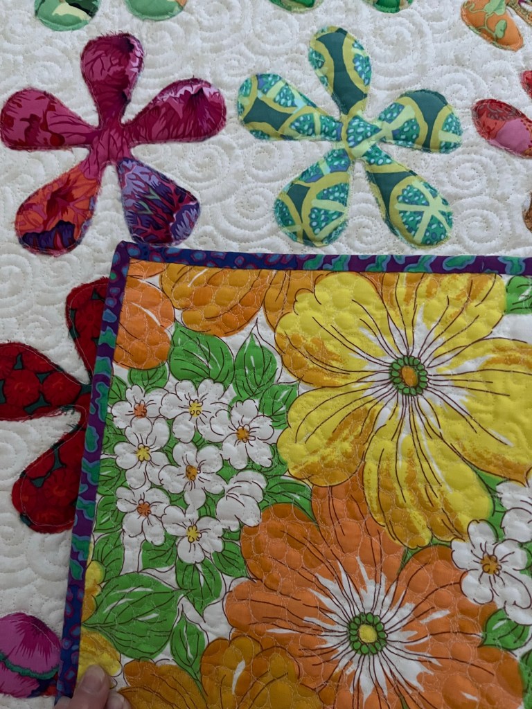 At the time talk was that only quilt shop quality fabric should be used for backings and definitely not sheets…I never liked to be limited to “creative rules” and chose to use a vintage bed sheet from the 70’s for my backing. The bedsheets from my child hood were so much fun!!