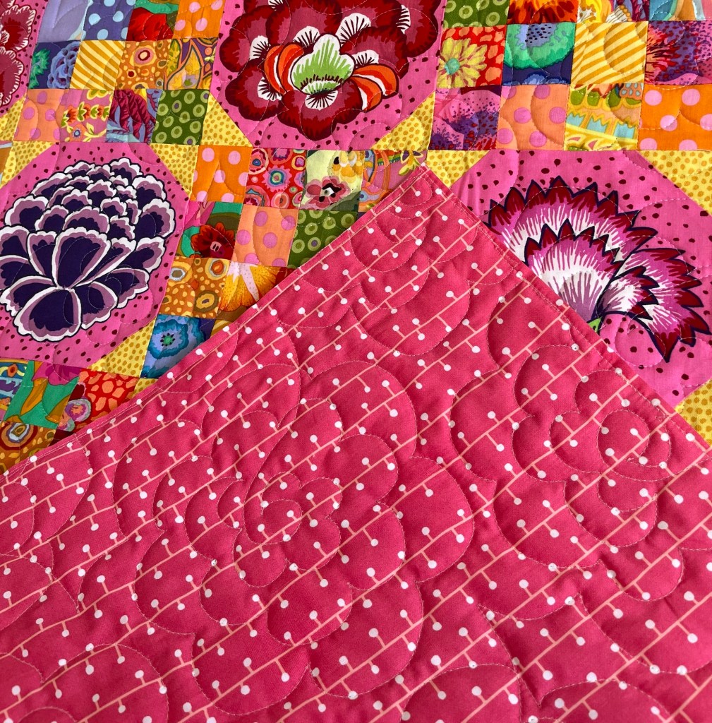 When we discussed backing I suggested a Kaffe print on the Cabbage print for its gorgeous large blooms and colours that complement her quilt top.