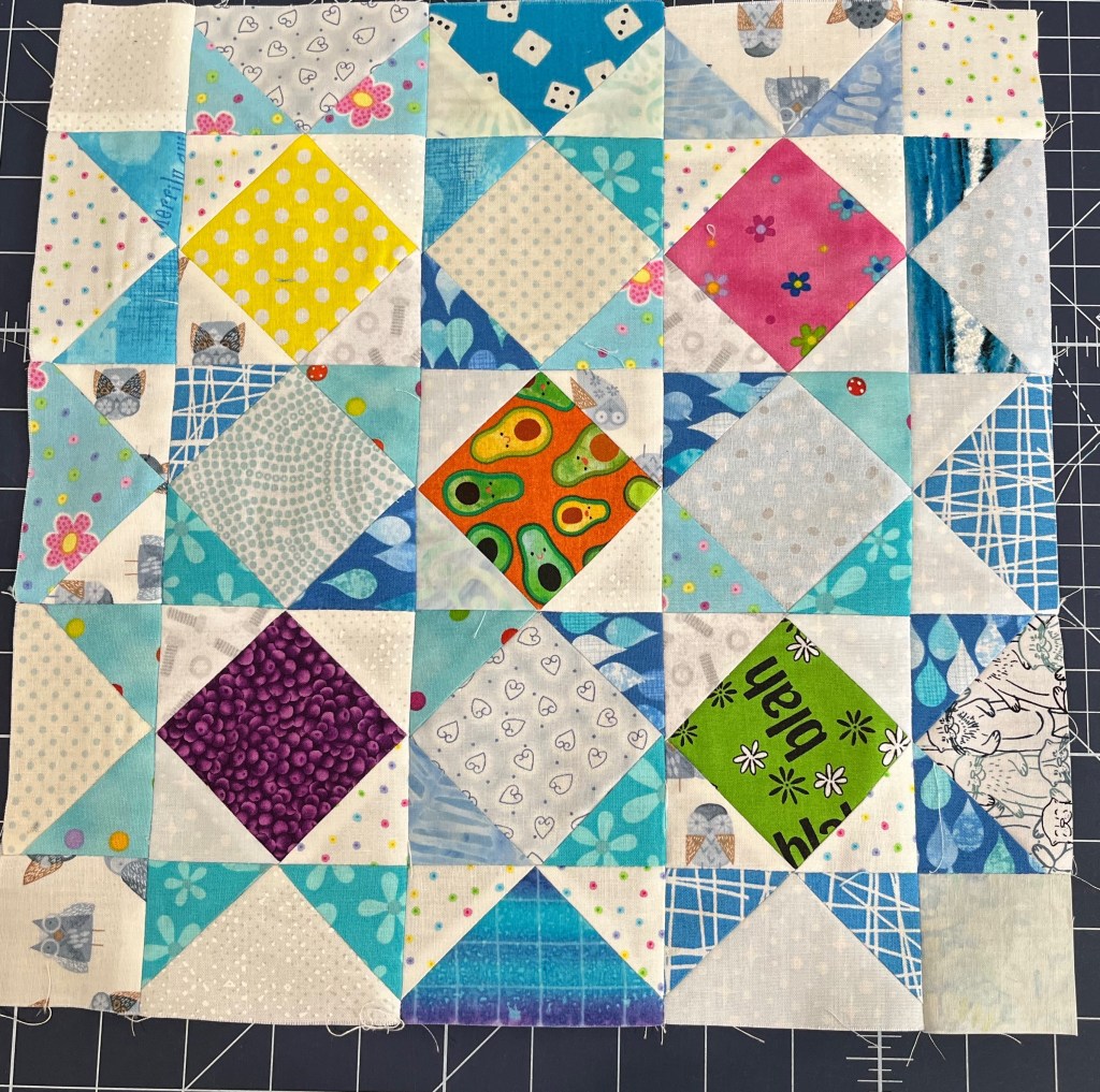 This block took a little time to play with. My quilt will have a whimsical tone to it. I have tried to tuck fun fabrics here and there that a child may delight in finding. Well maybe an adult as well.