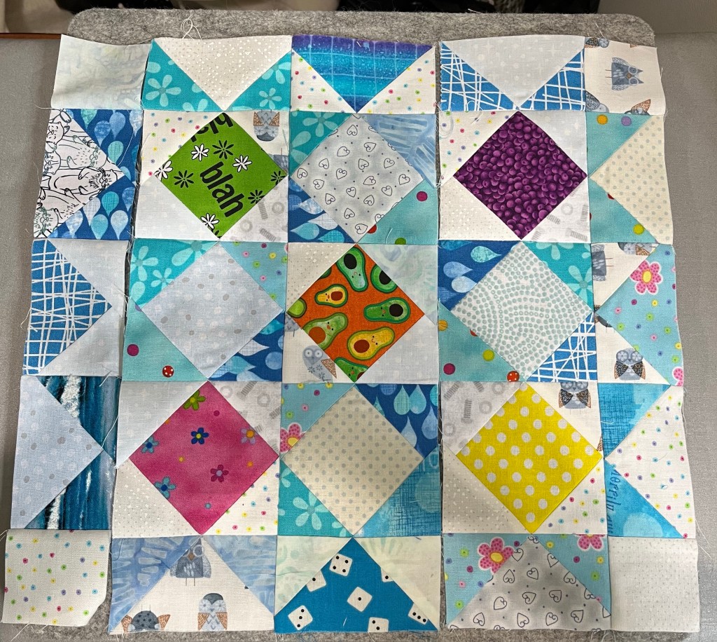 Sometimes spending too much time planning a scrappy block isn’t a great thing… I was almost finished this block when I noticed too much of the same thing in the upper left of the block. I also should have made the outside geese scrappy.