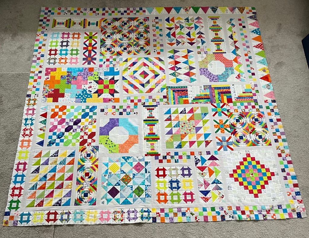 Well I finally slipped it into my Que and it’s quilted and trimmed. It will hanging in our upcoming quilt show if you are interested in a close up and personal look. I hope that it inspires other quilters to challenge themselves with a scrappy sampler!