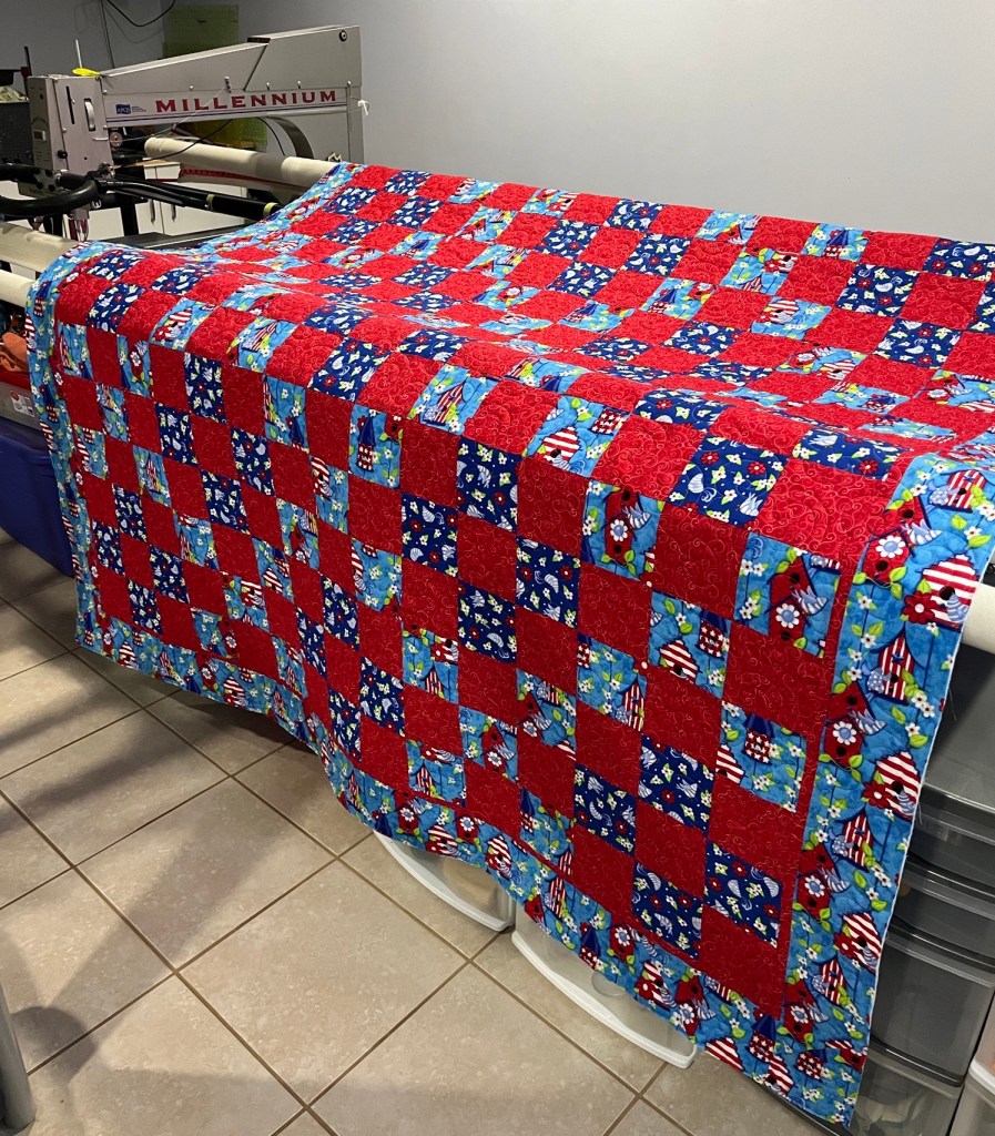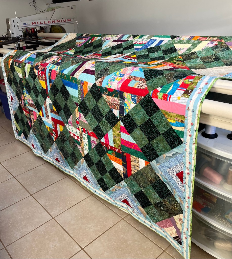 This quilt shows a fun way to showcase 4 patch scrap blocks, the backing inspired the quilting choice. I used the pantograph Shasta Daisy.