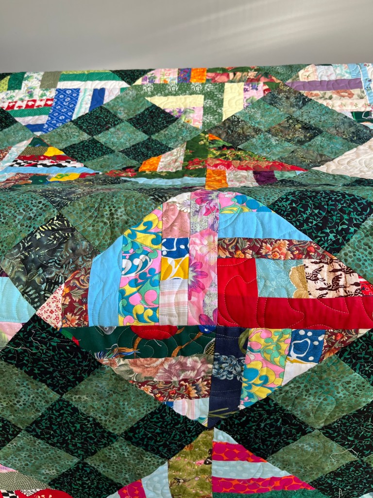 Anyone who knows me knows that I love scrap quilts and this one was no exception. There are several fabrics in this quilt that were not quilting cottons and some appeared to be from some time ago reminding me of my childhood. Ok the 70’s