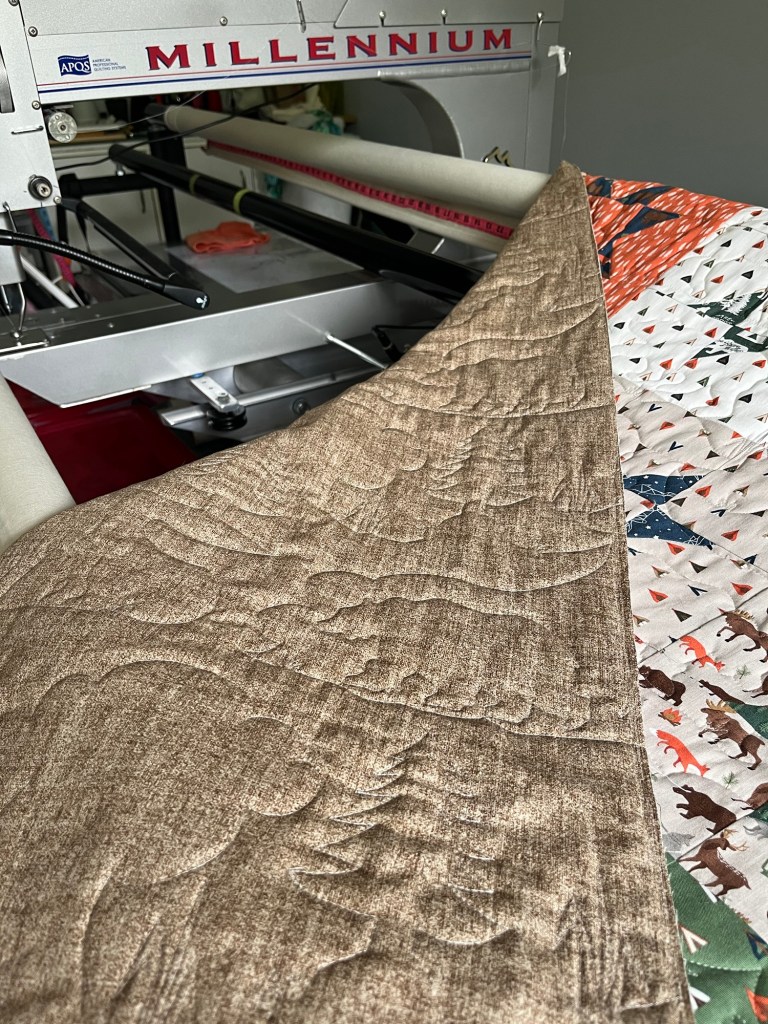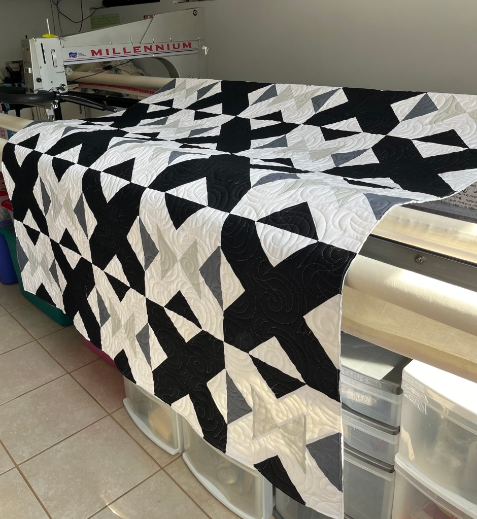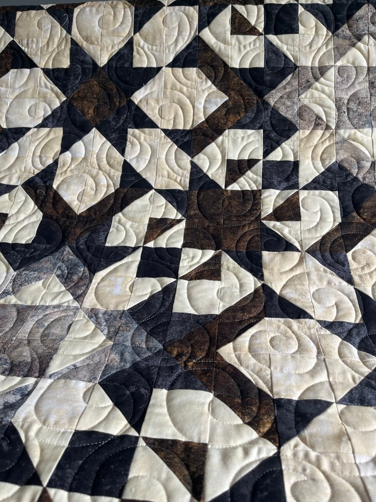 The backing is a winter scene, I chose the pantograph Star Swirl playing on the idea of winter night with swirling snow and a starry night…the curvy quilting with some points also works so nicely on angular piecing.
