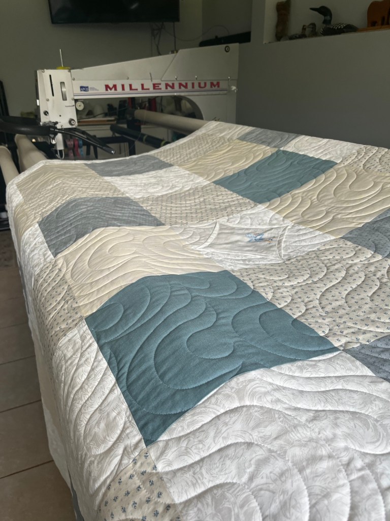 Both of these quilts were fun to add my touch to. This first one with its trains and the steam coming from the engine on the backing made me think of swirls…bear with my imagination…