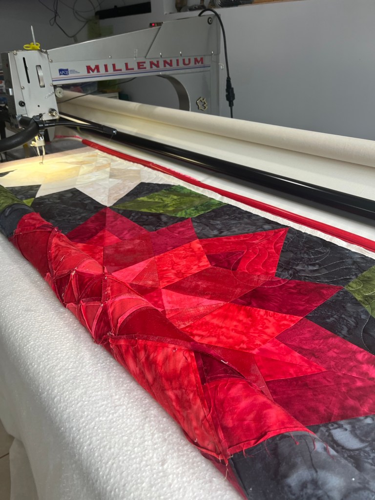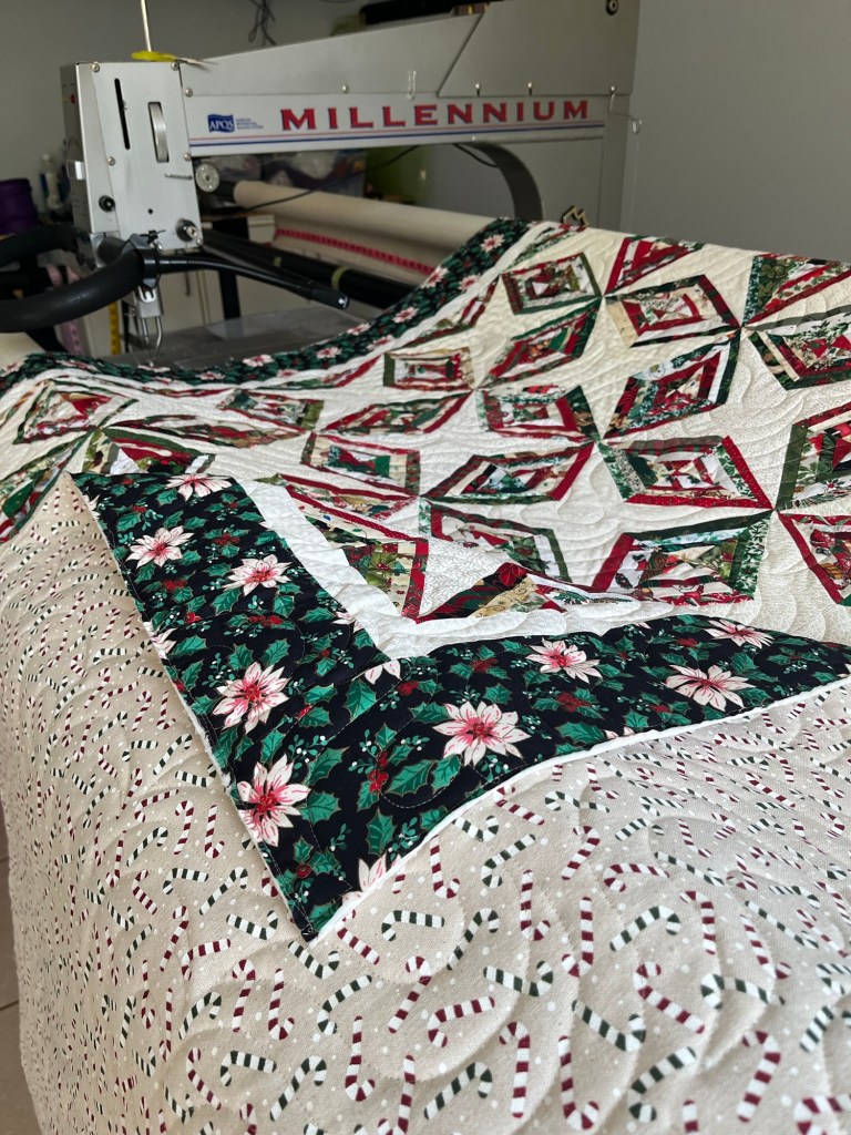 My customer chose the quilting design Bayside, it is what I call a non descript design meaning it’s a perfect background allowing the piecing design front stage! The poinsettias deserve front stage don’t they?