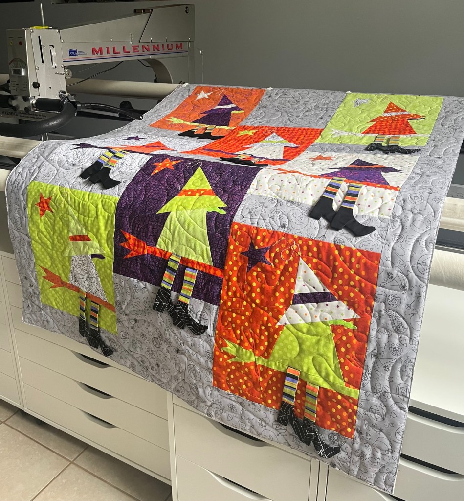 The quilt did present a challenge in that the witches legs hang freely. Using the quilting design Frite-nite I carefully worked around the legs not loosing any of the fun design.
